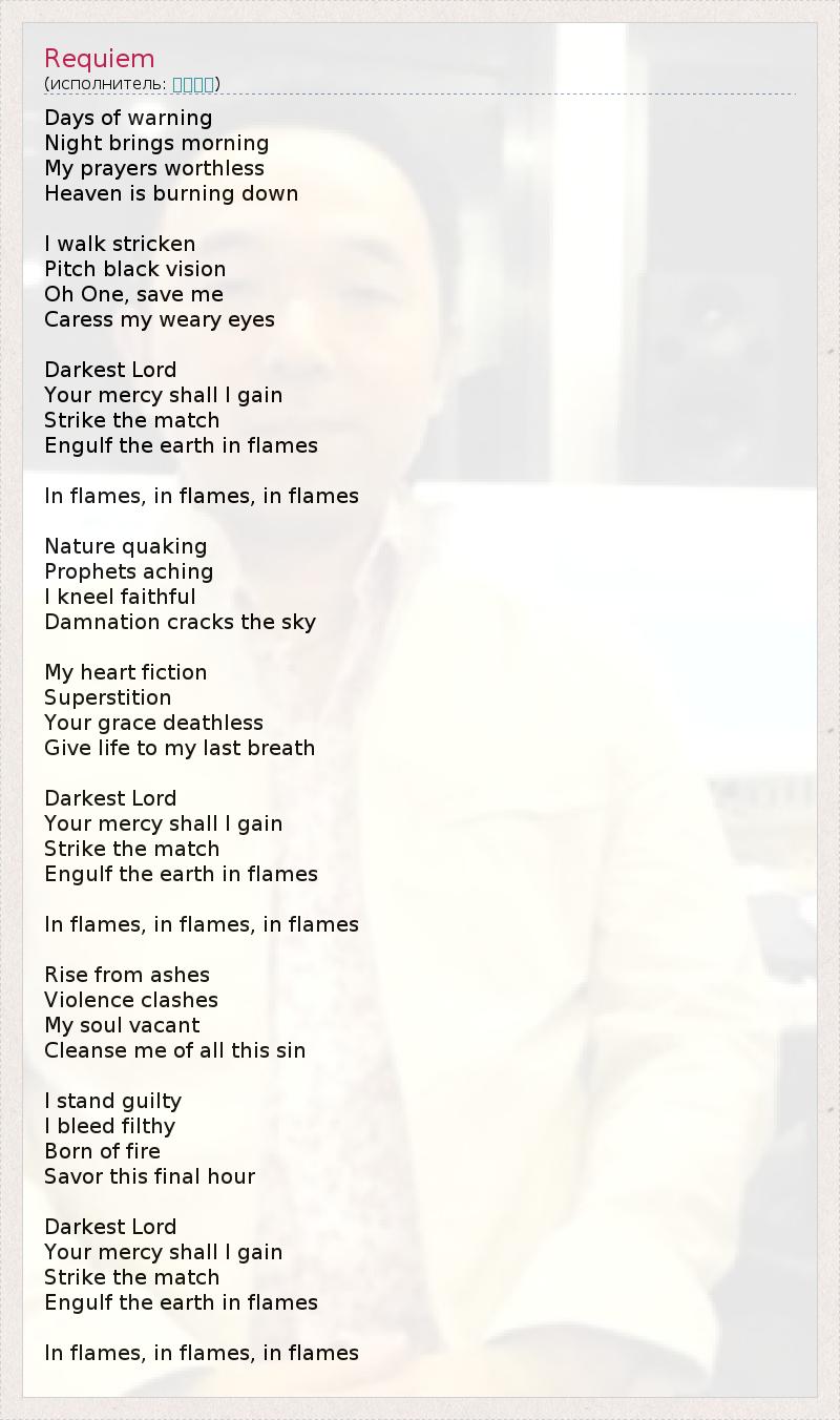 Days of warning Night brings morning My prayers worthless Heaven is burning down I walk stricken Pitch black vision Oh One, save me Caress my weary eyes Darkest Lord Your mercy shall I gain Strike the match Engulf the earth in flames In flames, in flames, in flames Nature quaking Prophets aching I kneel faithful Damnation cracks the sky My heart fiction Superstition Your grace deathless Give life to my last breath Darkest Lord Your mercy shall I gain Strike the match Engulf the earth in flames In flames, in flames, in flames Rise from ashes Violence clashes My soul vacant Cleanse me of all this sin I stand guilty I bleed filthy Born of fire Savor this final hour Darkest Lord Your mercy shall I gain Strike the match Engulf the earth in flames In flames, in flames, in flames