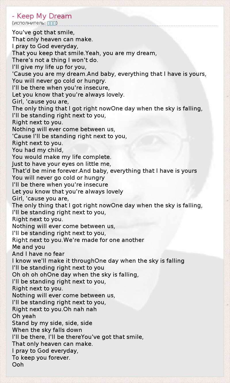 You've got that smile, That only heaven can make. I pray to God everyday, That you keep that smile.Yeah, you are my dream, There's not a thing I won't do. I'll give my life up for you, 'Cause you are my dream.And baby, everything that I have is yours, You will never go cold or hungry. I'll be there when you're insecure, Let you know that you're always lovely. Girl, 'cause you are, The only thing that I got right nowOne day when the sky is falling, I'll be standing right next to you, Right next to you. Nothing will ever come between us, 'Cause I'll be standing right next to you, Right next to you. You had my child, You would make my life complete. Just to have your eyes on little me, That'd be mine forever.And baby, everything that I have is yours You will never go cold or hungry I'll be there when you're insecure Let you know that you're always lovely Girl, 'cause you are, The only thing that I got right nowOne day when the sky is falling, I'll be standing right next to you, Right next to you. Nothing will ever come between us, I'll be standing right next to you, Right next to you.We're made for one another Me and you And I have no fear I know we'll make it throughOne day when the sky is falling I'll be standing right next to you Oh oh oh ohOne day when the sky is falling, I'll be standing right next to you, Right next to you. Nothing will ever come between us, I'll be standing right next to you, Right next to you.Oh nah nah Oh yeah Stand by my side, side, side When the sky falls down I'll be there, I'll be thereYou've got that smile, That only heaven can make. I pray to God everyday, To keep you forever. Ooh