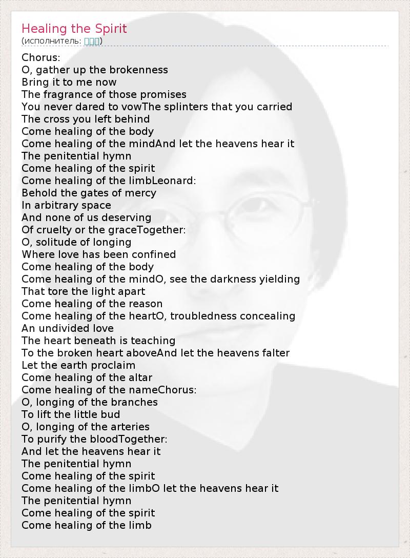 Chorus: O, gather up the brokenness Bring it to me now The fragrance of those promises You never dared to vowThe splinters that you carried The cross you left behind Come healing of the body Come healing of the mindAnd let the heavens hear it The penitential hymn Come healing of the spirit Come healing of the limbLeonard: Behold the gates of mercy In arbitrary space And none of us deserving Of cruelty or the graceTogether: O, solitude of longing Where love has been confined Come healing of the body Come healing of the mindO, see the darkness yielding That tore the light apart Come healing of the reason Come healing of the heartO, troubledness concealing An undivided love The heart beneath is teaching To the broken heart aboveAnd let the heavens falter Let the earth proclaim Come healing of the altar Come healing of the nameChorus: O, longing of the branches To lift the little bud O, longing of the arteries To purify the bloodTogether: And let the heavens hear it The penitential hymn Come healing of the spirit Come healing of the limbO let the heavens hear it The penitential hymn Come healing of the spirit Come healing of the limb