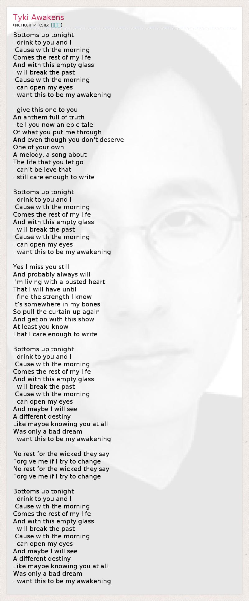 Bottoms up tonight I drink to you and I 'Cause with the morning Comes the rest of my life And with this empty glass I will break the past 'Cause with the morning I can open my eyes I want this to be my awakening I give this one to you An anthem full of truth I tell you now an epic tale Of what you put me through And even though you don't deserve One of your own A melody, a song about The life that you let go I can't believe that I still care enough to write Bottoms up tonight I drink to you and I 'Cause with the morning Comes the rest of my life And with this empty glass I will break the past 'Cause with the morning I can open my eyes I want this to be my awakening Yes I miss you still And probably always will I'm living with a busted heart That I will have until I find the strength I know It's somewhere in my bones So pull the curtain up again And get on with this show At least you know That I care enough to write Bottoms up tonight I drink to you and I 'Cause with the morning Comes the rest of my life And with this empty glass I will break the past 'Cause with the morning I can open my eyes And maybe I will see A different destiny Like maybe knowing you at all Was only a bad dream I want this to be my awakening No rest for the wicked they say Forgive me if I try to change No rest for the wicked they say Forgive me if I try to change Bottoms up tonight I drink to you and I 'Cause with the morning Comes the rest of my life And with this empty glass I will break the past 'Cause with the morning I can open my eyes And maybe I will see A different destiny Like maybe knowing you at all Was only a bad dream I want this to be my awakening