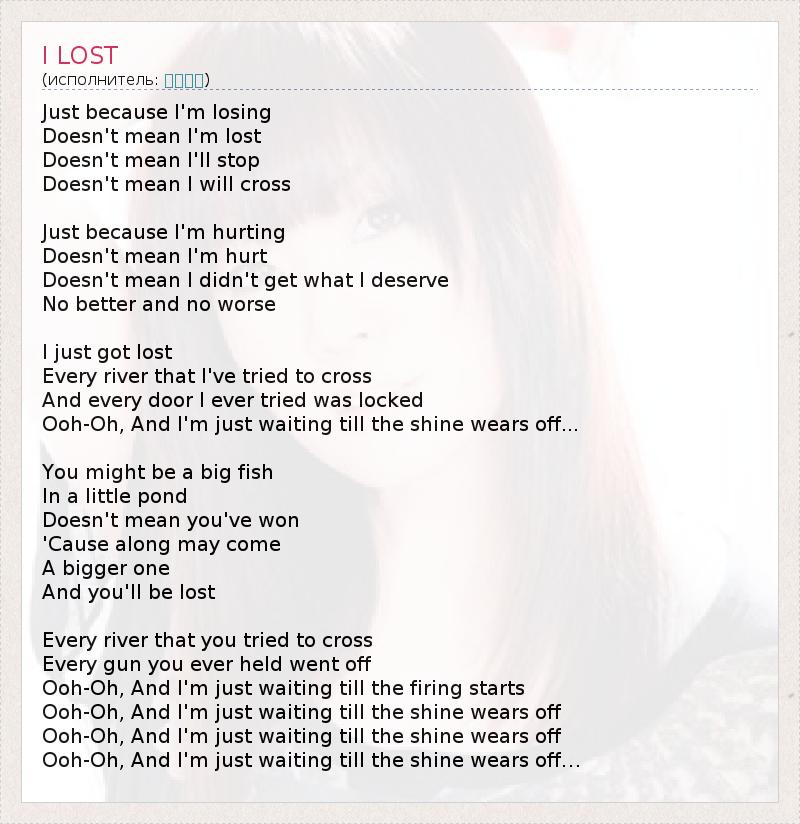 Just because I'm losing Doesn't mean I'm lost Doesn't mean I'll stop Doesn't mean I will cross Just because I'm hurting Doesn't mean I'm hurt Doesn't mean I didn't get what I deserve No better and no worse I just got lost Every river that I've tried to cross And every door I ever tried was locked Ooh-Oh, And I'm just waiting till the shine wears off... You might be a big fish In a little pond Doesn't mean you've won 'Cause along may come A bigger one And you'll be lost Every river that you tried to cross Every gun you ever held went off Ooh-Oh, And I'm just waiting till the firing starts Ooh-Oh, And I'm just waiting till the shine wears off Ooh-Oh, And I'm just waiting till the shine wears off Ooh-Oh, And I'm just waiting till the shine wears off…