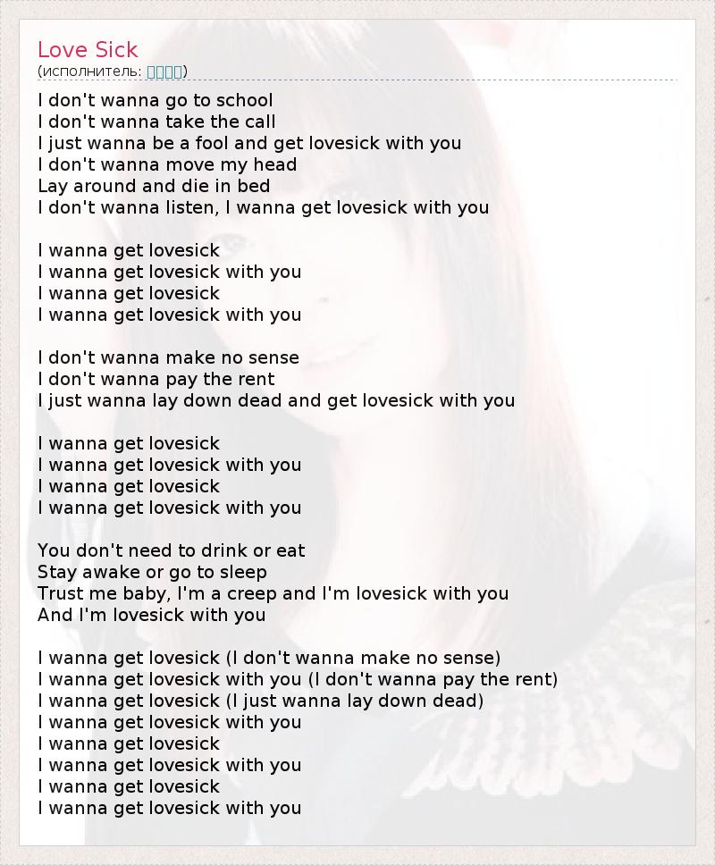 I don't wanna go to school I don't wanna take the call I just wanna be a fool and get lovesick with you I don't wanna move my head Lay around and die in bed I don't wanna listen, I wanna get lovesick with you I wanna get lovesick I wanna get lovesick with you I wanna get lovesick I wanna get lovesick with you I don't wanna make no sense I don't wanna pay the rent I just wanna lay down dead and get lovesick with you I wanna get lovesick I wanna get lovesick with you I wanna get lovesick I wanna get lovesick with you You don't need to drink or eat Stay awake or go to sleep Trust me baby, I'm a creep and I'm lovesick with you And I'm lovesick with you I wanna get lovesick (I don't wanna make no sense) I wanna get lovesick with you (I don't wanna pay the rent) I wanna get lovesick (I just wanna lay down dead) I wanna get lovesick with you I wanna get lovesick I wanna get lovesick with you I wanna get lovesick I wanna get lovesick with you
