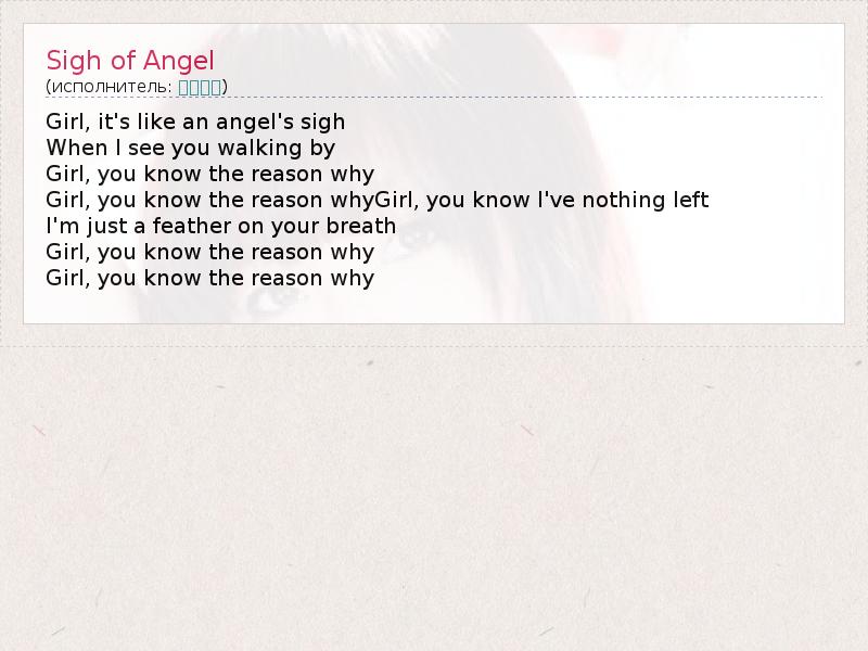 Girl, it's like an angel's sigh When I see you walking by Girl, you know the reason why Girl, you know the reason whyGirl, you know I've nothing left I'm just a feather on your breath Girl, you know the reason why Girl, you know the reason why