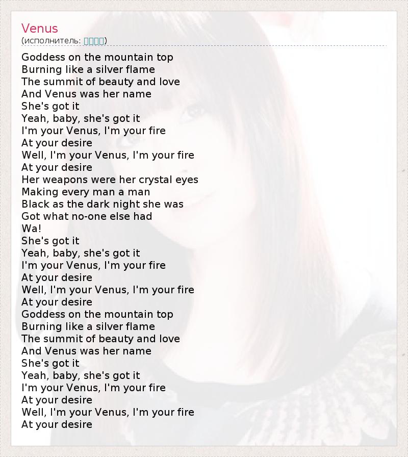 Goddess on the mountain top Burning like a silver flame The summit of beauty and love And Venus was her name She's got it Yeah, baby, she's got it I'm your Venus, I'm your fire At your desire Well, I'm your Venus, I'm your fire At your desire Her weapons were her crystal eyes Making every man a man Black as the dark night she was Got what no-one else had Wa! She's got it Yeah, baby, she's got it I'm your Venus, I'm your fire At your desire Well, I'm your Venus, I'm your fire At your desire Goddess on the mountain top Burning like a silver flame The summit of beauty and love And Venus was her name She's got it Yeah, baby, she's got it I'm your Venus, I'm your fire At your desire Well, I'm your Venus, I'm your fire At your desire