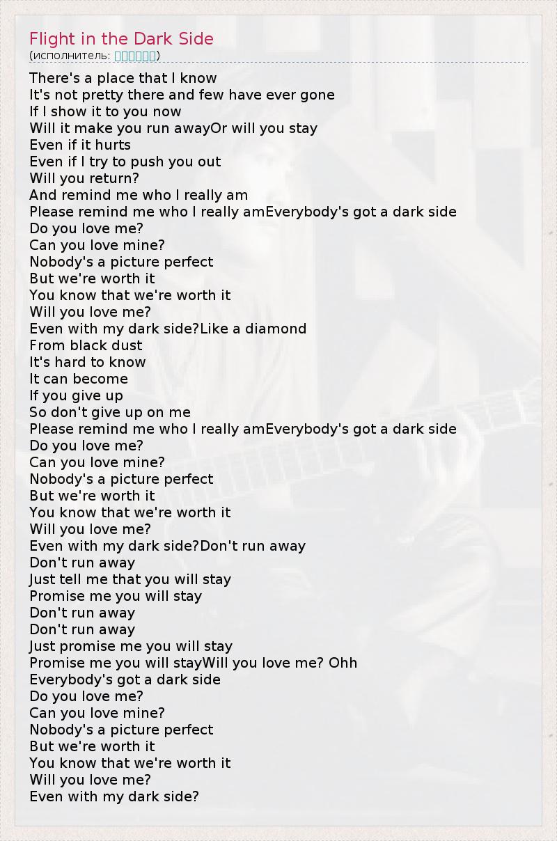 There's a place that I know It's not pretty there and few have ever gone If I show it to you now Will it make you run awayOr will you stay Even if it hurts Even if I try to push you out Will you return? And remind me who I really am Please remind me who I really amEverybody's got a dark side Do you love me? Can you love mine? Nobody's a picture perfect But we're worth it You know that we're worth it Will you love me? Even with my dark side?Like a diamond From black dust It's hard to know It can become If you give up So don't give up on me Please remind me who I really amEverybody's got a dark side Do you love me? Can you love mine? Nobody's a picture perfect But we're worth it You know that we're worth it Will you love me? Even with my dark side?Don't run away Don't run away Just tell me that you will stay Promise me you will stay Don't run away Don't run away Just promise me you will stay Promise me you will stayWill you love me? Ohh Everybody's got a dark side Do you love me? Can you love mine? Nobody's a picture perfect But we're worth it You know that we're worth it Will you love me? Even with my dark side?