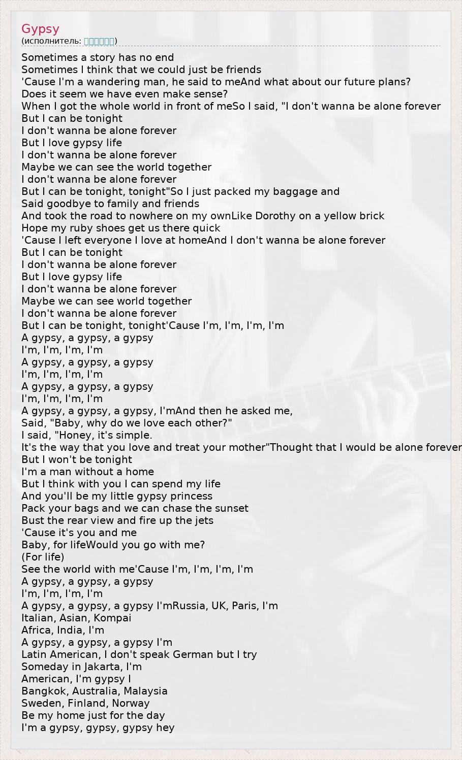 Sometimes a story has no end Sometimes I think that we could just be friends 'Cause I'm a wandering man, he said to meAnd what about our future plans? Does it seem we have even make sense? When I got the whole world in front of meSo I said, "I don't wanna be alone forever But I can be tonight I don't wanna be alone forever But I love gypsy life I don't wanna be alone forever Maybe we can see the world together I don't wanna be alone forever But I can be tonight, tonight"So I just packed my baggage and Said goodbye to family and friends And took the road to nowhere on my ownLike Dorothy on a yellow brick Hope my ruby shoes get us there quick 'Cause I left everyone I love at homeAnd I don't wanna be alone forever But I can be tonight I don't wanna be alone forever But I love gypsy life I don't wanna be alone forever Maybe we can see world together I don't wanna be alone forever But I can be tonight, tonight'Cause I'm, I'm, I'm, I'm A gypsy, a gypsy, a gypsy I'm, I'm, I'm, I'm A gypsy, a gypsy, a gypsy I'm, I'm, I'm, I'm A gypsy, a gypsy, a gypsy I'm, I'm, I'm, I'm A gypsy, a gypsy, a gypsy, I'mAnd then he asked me, Said, "Baby, why do we love each other?" I said, "Honey, it's simple. It's the way that you love and treat your mother"Thought that I would be alone forever But I won't be tonight I'm a man without a home But I think with you I can spend my life And you'll be my little gypsy princess Pack your bags and we can chase the sunset Bust the rear view and fire up the jets 'Cause it's you and me Baby, for lifeWould you go with me? (For life) See the world with me'Cause I'm, I'm, I'm, I'm A gypsy, a gypsy, a gypsy I'm, I'm, I'm, I'm A gypsy, a gypsy, a gypsy I'mRussia, UK, Paris, I'm Italian, Asian, Kompai Africa, India, I'm A gypsy, a gypsy, a gypsy I'm Latin American, I don't speak German but I try Someday in Jakarta, I'm American, I'm gypsy I Bangkok, Australia, Malaysia Sweden, Finland, Norway Be my home just for the day I'm a gypsy, gypsy, gypsy hey