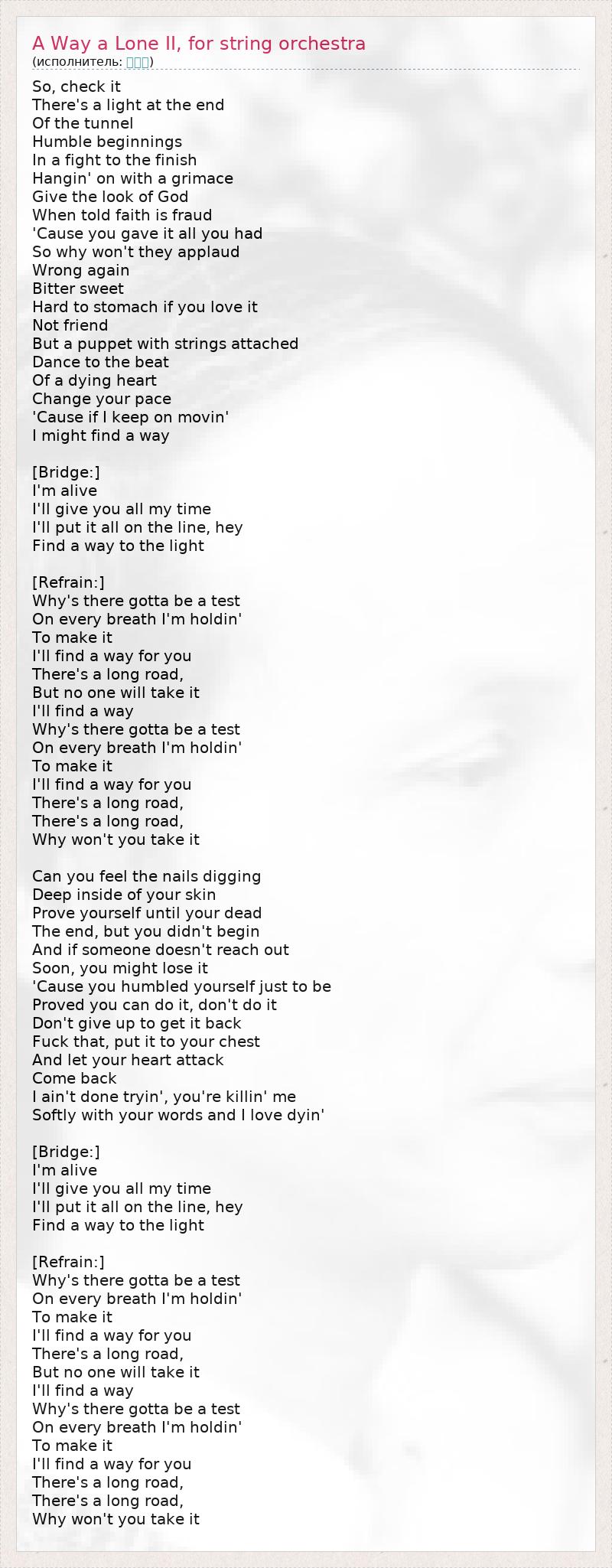 So, check it There's a light at the end Of the tunnel Humble beginnings In a fight to the finish Hangin' on with a grimace Give the look of God When told faith is fraud 'Cause you gave it all you had So why won't they applaud Wrong again Bitter sweet Hard to stomach if you love it Not friend But a puppet with strings attached Dance to the beat Of a dying heart Change your pace 'Cause if I keep on movin' I might find a way [Bridge:] I'm alive I'll give you all my time I'll put it all on the line, hey Find a way to the light [Refrain:] Why's there gotta be a test On every breath I'm holdin' To make it I'll find a way for you There's a long road, But no one will take it I'll find a way Why's there gotta be a test On every breath I'm holdin' To make it I'll find a way for you There's a long road, There's a long road, Why won't you take it Can you feel the nails digging Deep inside of your skin Prove yourself until your dead The end, but you didn't begin And if someone doesn't reach out Soon, you might lose it 'Cause you humbled yourself just to be Proved you can do it, don't do it Don't give up to get it back Fuck that, put it to your chest And let your heart attack Come back I ain't done tryin', you're killin' me Softly with your words and I love dyin' [Bridge:] I'm alive I'll give you all my time I'll put it all on the line, hey Find a way to the light [Refrain:] Why's there gotta be a test On every breath I'm holdin' To make it I'll find a way for you There's a long road, But no one will take it I'll find a way Why's there gotta be a test On every breath I'm holdin' To make it I'll find a way for you There's a long road, There's a long road, Why won't you take it
