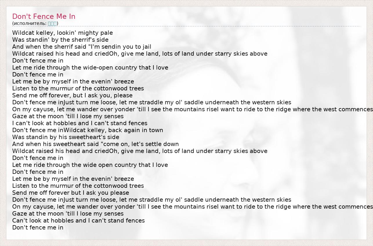 Wildcat kelley, lookin' mighty pale Was standin' by the sherrif's side And when the sherrif said "I'm sendin you to jail Wildcat raised his head and criedOh, give me land, lots of land under starry skies above Don't fence me in Let me ride through the wide-open country that I love Don't fence me in Let me be by myself in the evenin' breeze Listen to the murmur of the cottonwood trees Send me off forever, but I ask you, please Don't fence me inJust turn me loose, let me straddle my ol' saddle underneath the western skies On my cayuse, let me wander over yonder 'till I see the mountains riseI want to ride to the ridge where the west commences Gaze at the moon 'till I lose my senses I can't look at hobbles and I can't stand fences Don't fence me inWildcat kelley, back again in town Was standin by his sweetheart's side And when his sweetheart said "come on, let's settle down Wildcat raised his head and criedOh, give me land, lots of land under starry skies above Don't fence me in Let me ride through the wide open country that I love Don't fence me in Let me be by myself in the evenin' breeze Listen to the murmur of the cottonwood trees Send me off forever but I ask you please Don't fence me inJust turn me loose, let me straddle my ol' saddle underneath the western skies On my cayuse, let me wander over yonder 'till I see the mountains riseI want to ride to the ridge where the west commences Gaze at the moon 'till I lose my senses Can't look at hobbles and I can't stand fences Don't fence me in