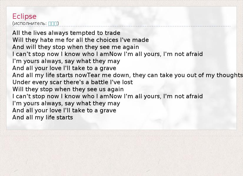 I can't stop now I know who I amNow I'm all yours, I'm not afraid