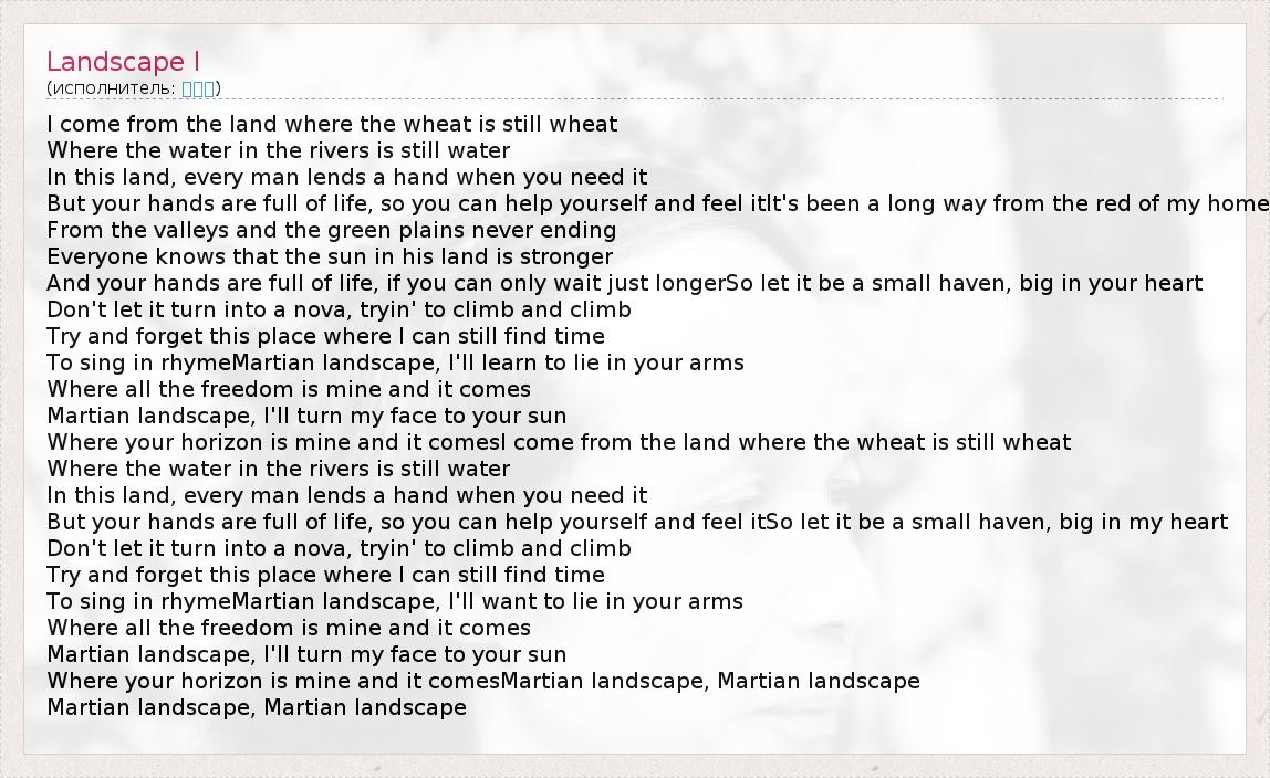 I come from the land where the wheat is still wheat Where the water in the rivers is still water In this land, every man lends a hand when you need it But your hands are full of life, so you can help yourself and feel itIt's been a long way from the red of my home From the valleys and the green plains never ending Everyone knows that the sun in his land is stronger And your hands are full of life, if you can only wait just longerSo let it be a small haven, big in your heart Don't let it turn into a nova, tryin' to climb and climb Try and forget this place where I can still find time To sing in rhymeMartian landscape, I'll learn to lie in your arms Where all the freedom is mine and it comes Martian landscape, I'll turn my face to your sun Where your horizon is mine and it comesI come from the land where the wheat is still wheat Where the water in the rivers is still water In this land, every man lends a hand when you need it But your hands are full of life, so you can help yourself and feel itSo let it be a small haven, big in my heart Don't let it turn into a nova, tryin' to climb and climb Try and forget this place where I can still find time To sing in rhymeMartian landscape, I'll want to lie in your arms Where all the freedom is mine and it comes Martian landscape, I'll turn my face to your sun Where your horizon is mine and it comesMartian landscape, Martian landscape Martian landscape, Martian landscape