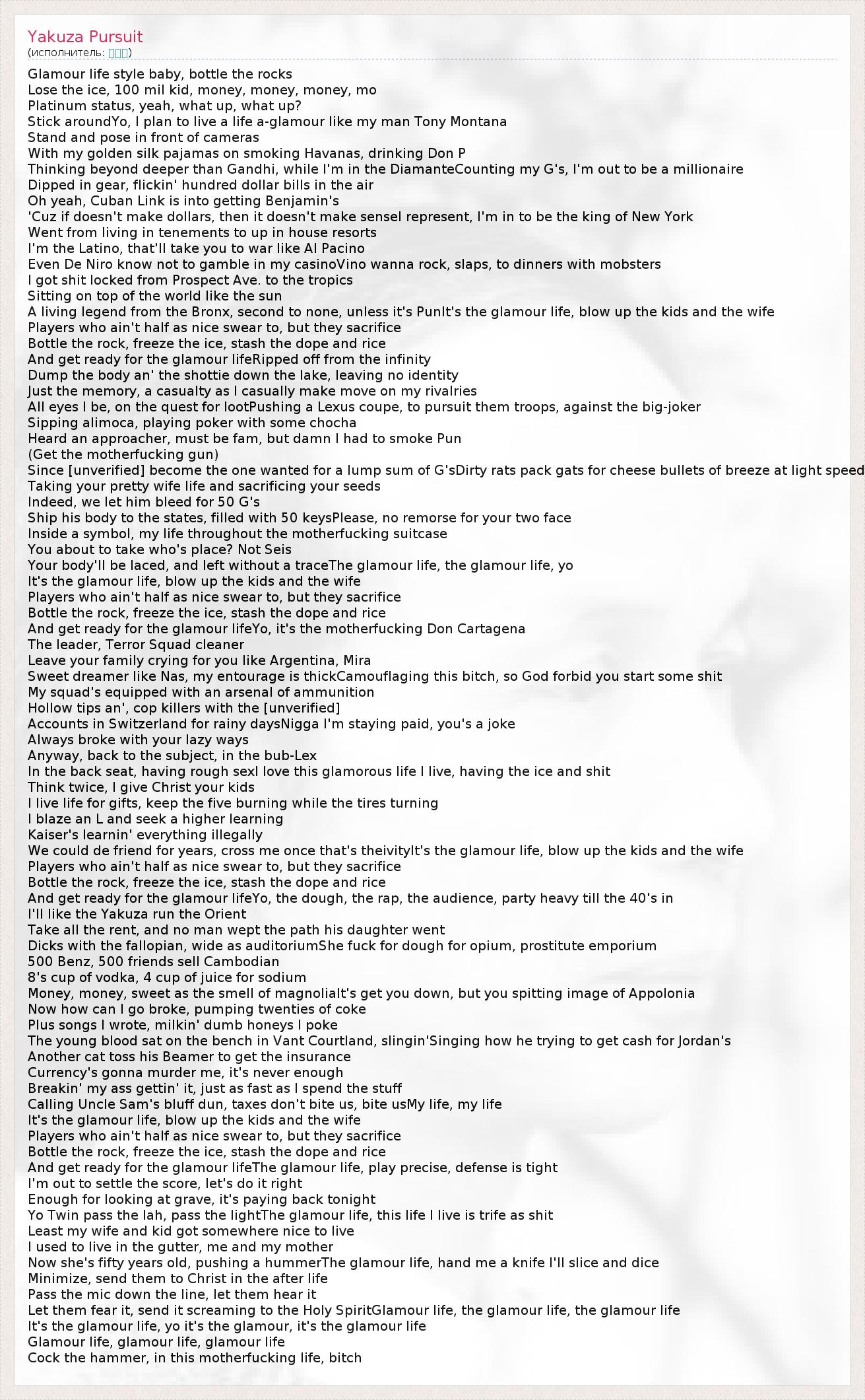 А как ты думаешь, о чем песня "Yakuza Pursuit" ?