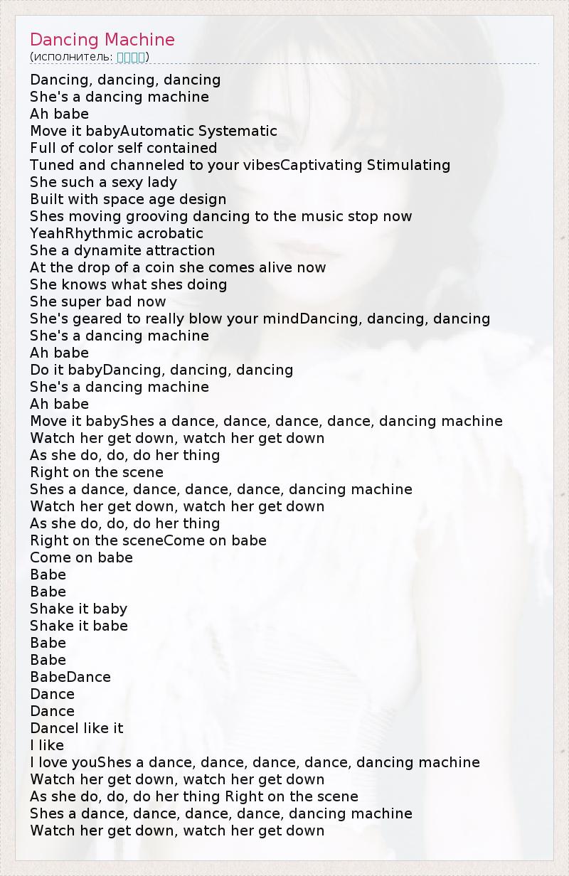 Dancing, dancing, dancing She's a dancing machine Ah babe Move it babyAutomatic Systematic Full of color self contained Tuned and channeled to your vibesCaptivating Stimulating She such a sexy lady Built with space age design Shes moving grooving dancing to the music stop now YeahRhythmic acrobatic She a dynamite attraction At the drop of a coin she comes alive now She knows what shes doing She super bad now She's geared to really blow your mindDancing, dancing, dancing She's a dancing machine Ah babe Do it babyDancing, dancing, dancing She's a dancing machine Ah babe Move it babyShes a dance, dance, dance, dance, dancing machine Watch her get down, watch her get down As she do, do, do her thing Right on the scene Shes a dance, dance, dance, dance, dancing machine Watch her get down, watch her get down As she do, do, do her thing Right on the sceneCome on babe Come on babe Babe Babe Shake it baby Shake it babe Babe Babe BabeDance Dance Dance DanceI like it I like I love youShes a dance, dance, dance, dance, dancing machine Watch her get down, watch her get down As she do, do, do her thing Right on the scene Shes a dance, dance, dance, dance, dancing machine Watch her get down, watch her get down