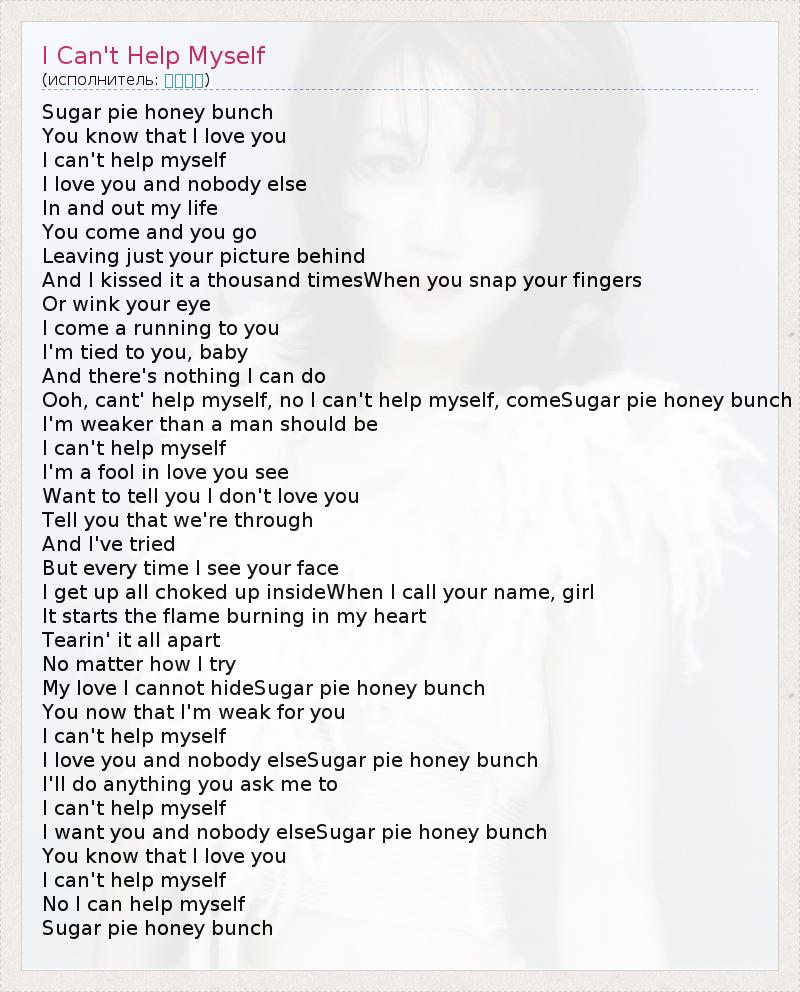 Sugar pie honey bunch You know that I love you I can't help myself I love you and nobody else In and out my life You come and you go Leaving just your picture behind And I kissed it a thousand timesWhen you snap your fingers Or wink your eye I come a running to you I'm tied to you, baby And there's nothing I can do Ooh, cant' help myself, no I can't help myself, comeSugar pie honey bunch I'm weaker than a man should be I can't help myself I'm a fool in love you see Want to tell you I don't love you Tell you that we're through And I've tried But every time I see your face I get up all choked up insideWhen I call your name, girl It starts the flame burning in my heart Tearin' it all apart No matter how I try My love I cannot hideSugar pie honey bunch You now that I'm weak for you I can't help myself I love you and nobody elseSugar pie honey bunch I'll do anything you ask me to I can't help myself I want you and nobody elseSugar pie honey bunch You know that I love you I can't help myself No I can help myself Sugar pie honey bunch