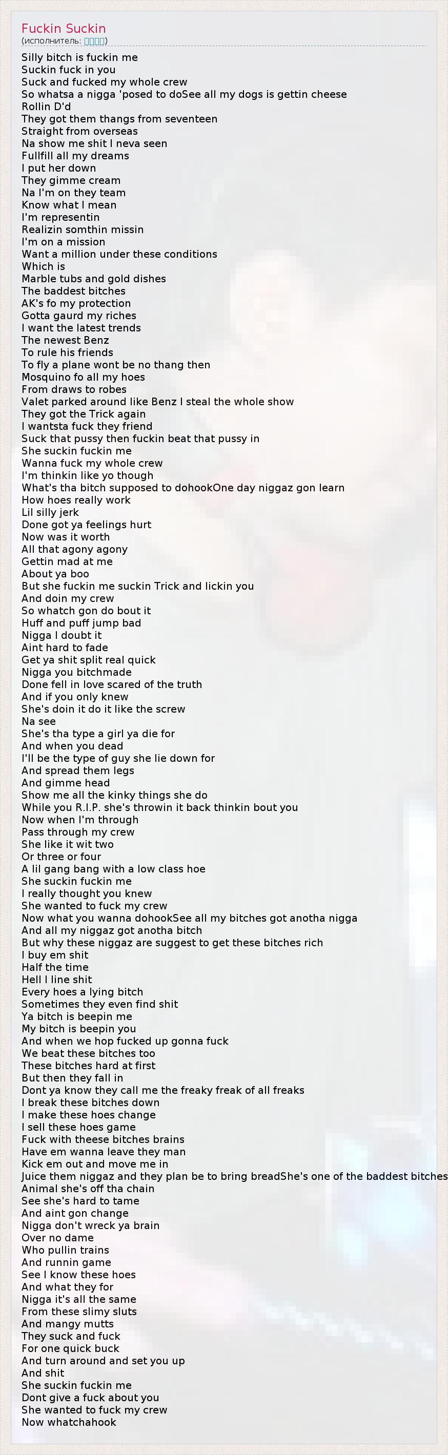 Silly bitch is fuckin me Suckin fuck in you Suck and fucked my whole crew So whatsa a nigga 'posed to doSee all my dogs is gettin cheese Rollin D'd They got them thangs from seventeen Straight from overseas Na show me shit I neva seen Fullfill all my dreams I put her down They gimme cream Na I'm on they team Know what I mean I'm representin Realizin somthin missin I'm on a mission Want a million under these conditions Which is Marble tubs and gold dishes The baddest bitches AK's fo my protection Gotta gaurd my riches I want the latest trends The newest Benz To rule his friends To fly a plane wont be no thang then Mosquino fo all my hoes From draws to robes Valet parked around like Benz I steal the whole show They got the Trick again I wantsta fuck they friend Suck that pussy then fuckin beat that pussy in She suckin fuckin me Wanna fuck my whole crew I'm thinkin like yo though What's tha bitch supposed to dohookOne day niggaz gon learn How hoes really work Lil silly jerk Done got ya feelings hurt Now was it worth All that agony agony Gettin mad at me About ya boo But she fuckin me suckin Trick and lickin you And doin my crew So whatch gon do bout it Huff and puff jump bad Nigga I doubt it Aint hard to fade Get ya shit split real quick Nigga you bitchmade Done fell in love scared of the truth And if you only knew She's doin it do it like the screw Na see She's tha type a girl ya die for And when you dead I'll be the type of guy she lie down for And spread them legs And gimme head Show me all the kinky things she do While you R.I.P. she's throwin it back thinkin bout you Now when I'm through Pass through my crew She like it wit two Or three or four A lil gang bang with a low class hoe She suckin fuckin me I really thought you knew She wanted to fuck my crew Now what you wanna dohookSee all my bitches got anotha nigga And all my niggaz got anotha bitch But why these niggaz are suggest to get these bitches rich I buy em shit Half the time Hell I line shit Every hoes a lying bitch Sometimes they even find shit Ya bitch is beepin me My bitch is beepin you And when we hop fucked up gonna fuck We beat these bitches too These bitches hard at first But then they fall in Dont ya know they call me the freaky freak of all freaks I break these bitches down I make these hoes change I sell these hoes game Fuck with theese bitches brains Have em wanna leave they man Kick em out and move me in Juice them niggaz and they plan be to bring breadShe's one of the baddest bitches Animal she's off tha chain See she's hard to tame And aint gon change Nigga don't wreck ya brain Over no dame Who pullin trains And runnin game See I know these hoes And what they for Nigga it's all the same From these slimy sluts And mangy mutts They suck and fuck For one quick buck And turn around and set you up And shit She suckin fuckin me Dont give a fuck about you She wanted to fuck my crew Now whatchahook