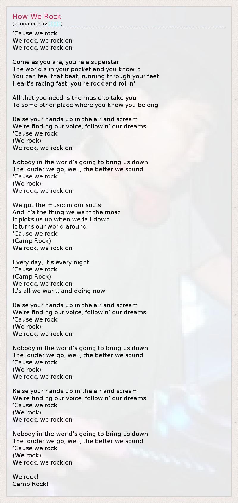 'Cause we rock We rock, we rock on We rock, we rock on Come as you are, you're a superstar The world's in your pocket and you know it You can feel that beat, running through your feet Heart's racing fast, you're rock and rollin' All that you need is the music to take you To some other place where you know you belong Raise your hands up in the air and scream We're finding our voice, followin' our dreams 'Cause we rock (We rock) We rock, we rock on Nobody in the world's going to bring us down The louder we go, well, the better we sound 'Cause we rock (We rock) We rock, we rock on We got the music in our souls And it's the thing we want the most It picks us up when we fall down It turns our world around 'Cause we rock (Camp Rock) We rock, we rock on Every day, it's every night 'Cause we rock (Camp Rock) We rock, we rock on It's all we want, and doing now Raise your hands up in the air and scream We're finding our voice, followin' our dreams 'Cause we rock (We rock) We rock, we rock on Nobody in the world's going to bring us down The louder we go, well, the better we sound 'Cause we rock (We rock) We rock, we rock on Raise your hands up in the air and scream We're finding our voice, followin' our dreams 'Cause we rock (We rock) We rock, we rock on Nobody in the world's going to bring us down The louder we go, well, the better we sound 'Cause we rock (We rock) We rock, we rock on We rock! Camp Rock!