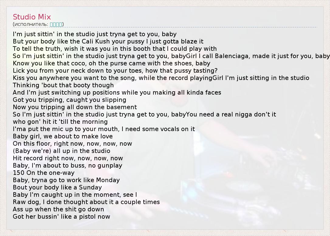 I'm just sittin' in the studio just tryna get to you, baby But your body like the Cali Kush your pussy I just gotta blaze it To tell the truth, wish it was you in this booth that I could play with So I'm just sittin' in the studio just tryna get to you, babyGirl I call Balenciaga, made it just for you, baby Know you like that coco, oh the purse came with the shoes, baby Lick you from your neck down to your toes, how that pussy tasting? Kiss you anywhere you want to the song, while the record playingGirl I'm just sitting in the studio Thinking 'bout that booty though And I'm just switching up positions while you making all kinda faces Got you tripping, caught you slipping Now you tripping all down the basement So I'm just sittin' in the studio just tryna get to you, babyYou need a real nigga don't it who gon' hit it 'till the morning I'ma put the mic up to your mouth, I need some vocals on it Baby girl, we about to make love On this floor, right now, now, now, now (Baby we're) all up in the studio Hit record right now, now, now, now Baby, I'm about to buss, no gunplay 150 On the one-way Baby, tryna go to work like Monday Bout your body like a Sunday Baby I'm caught up in the moment, see I Raw dog, I done thought about it a couple times Ass up when the shit go down Got her bussin' like a pistol now