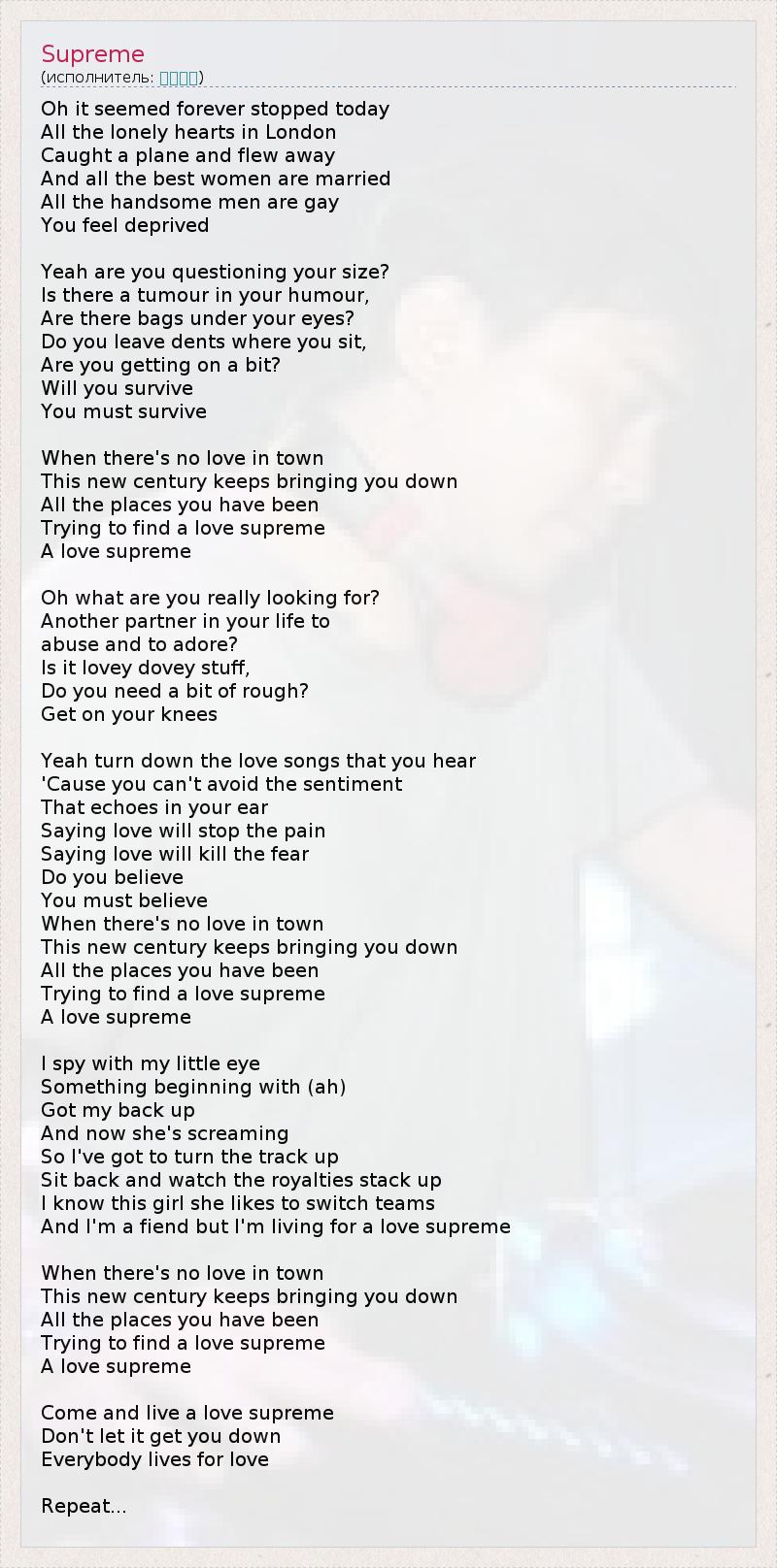 Oh it seemed forever stopped today All the lonely hearts in London Caught a plane and flew away And all the best women are married All the handsome men are gay You feel deprived Yeah are you questioning your size? Is there a tumour in your humour, Are there bags under your eyes? Do you leave dents where you sit, Are you getting on a bit? Will you survive You must survive When there's no love in town This new century keeps bringing you down All the places you have been Trying to find a love supreme A love supreme Oh what are you really looking for? Another partner in your life to abuse and to adore? Is it lovey dovey stuff, Do you need a bit of rough? Get on your knees Yeah turn down the love songs that you hear 'Cause you can't avoid the sentiment That echoes in your ear Saying love will stop the pain Saying love will kill the fear Do you believe You must believe When there's no love in town This new century keeps bringing you down All the places you have been Trying to find a love supreme A love supreme I spy with my little eye Something beginning with (ah) Got my back up And now she's screaming So I've got to turn the track up Sit back and watch the royalties stack up I know this girl she likes to switch teams And I'm a fiend but I'm living for a love supreme When there's no love in town This new century keeps bringing you down All the places you have been Trying to find a love supreme A love supreme Come and live a love supreme Don't let it get you down Everybody lives for love Repeat...