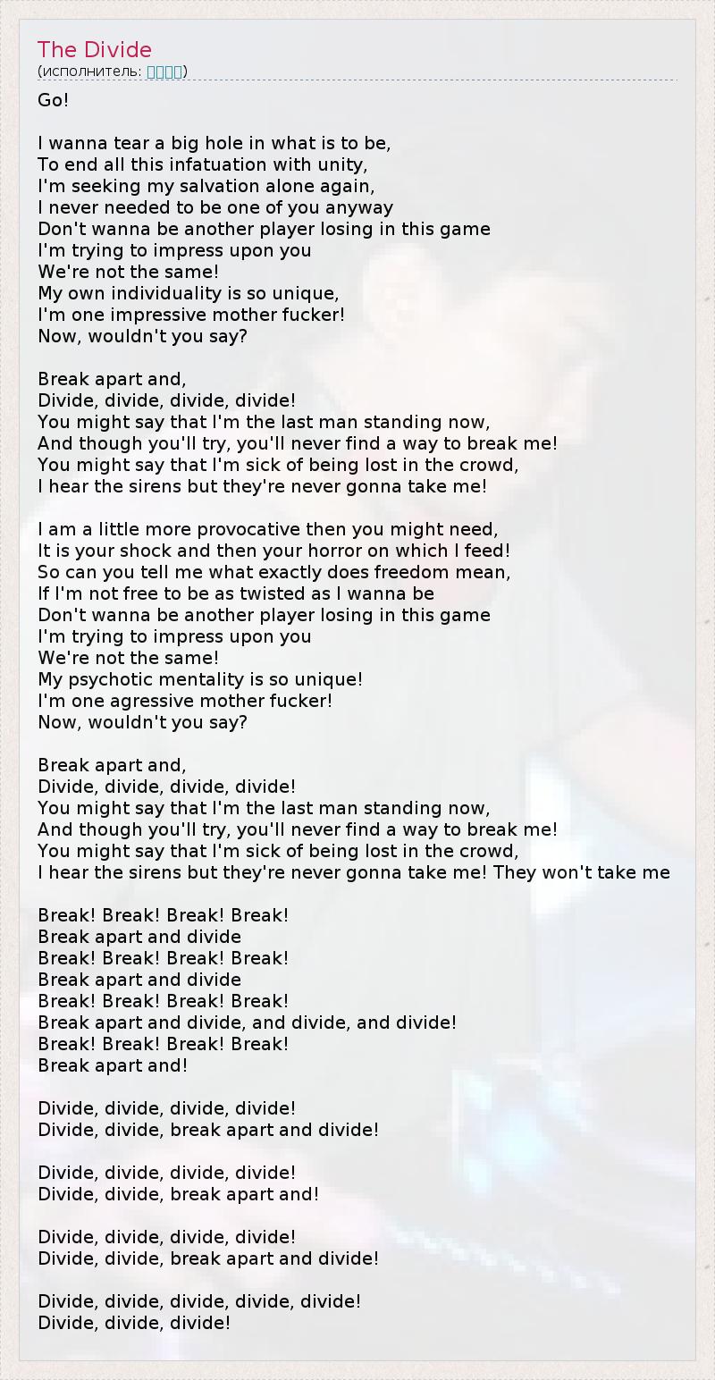 Go! I wanna tear a big hole in what is to be, To end all this infatuation with unity, I'm seeking my salvation alone again, I never needed to be one of you anyway Don't wanna be another player losing in this game I'm trying to impress upon you We're not the same! My own individuality is so unique, I'm one impressive mother fucker! Now, wouldn't you say? Break apart and, Divide, divide, divide, divide! You might say that I'm the last man standing now, And though you'll try, you'll never find a way to break me! You might say that I'm sick of being lost in the crowd, I hear the sirens but they're never gonna take me! I am a little more provocative then you might need, It is your shock and then your horror on which I feed! So can you tell me what exactly does freedom mean, If I'm not free to be as twisted as I wanna be Don't wanna be another player losing in this game I'm trying to impress upon you We're not the same! My psychotic mentality is so unique! I'm one agressive mother fucker! Now, wouldn't you say? Break apart and, Divide, divide, divide, divide! You might say that I'm the last man standing now, And though you'll try, you'll never find a way to break me! You might say that I'm sick of being lost in the crowd, I hear the sirens but they're never gonna take me! They won't take me Break! Break! Break! Break! Break apart and divide Break! Break! Break! Break! Break apart and divide Break! Break! Break! Break! Break apart and divide, and divide, and divide! Break! Break! Break! Break! Break apart and! Divide, divide, divide, divide! Divide, divide, break apart and divide! Divide, divide, divide, divide! Divide, divide, break apart and! Divide, divide, divide, divide! Divide, divide, break apart and divide! Divide, divide, divide, divide, divide! Divide, divide, divide!