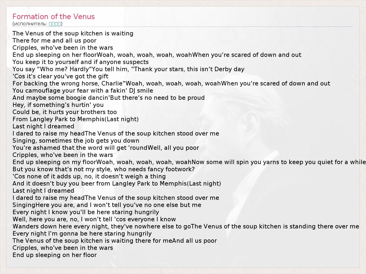 The Venus of the soup kitchen is waiting There for me and all us poor Cripples, who've been in the wars End up sleeping on her floorWoah, woah, woah, woah, woahWhen you're scared of down and out You keep it to yourself and if anyone suspects You say "Who me? Hardly"You tell him, "Thank your stars, this isn't Derby day 'Cos it's clear you've got the gift For backing the wrong horse, Charlie"Woah, woah, woah, woah, woahWhen you're scared of down and out You camouflage your fear with a fakin' DJ smile And maybe some boogie dancin'But there's no need to be proud Hey, if something's hurtin' you Could be, it hurts your brothers too From Langley Park to Memphis(Last night) Last night I dreamed I dared to raise my headThe Venus of the soup kitchen stood over me Singing, sometimes the job gets you down You're ashamed that the word will get 'roundWell, all you poor Cripples, who've been in the wars End up sleeping on my floorWoah, woah, woah, woah, woahNow some will spin you yarns to keep you quiet for a while But you know that's not my style, who needs fancy footwork? 'Cos none of it adds up, no, it doesn't weigh a thing And it doesn't buy you beer from Langley Park to Memphis(Last night) Last night I dreamed I dared to raise my headThe Venus of the soup kitchen stood over me SingingHere you are, and I won't tell you've no one else but me Every night I know you'll be here staring hungrily Well, here you are, no, I won't tell 'cos everyone I know Wanders down here every night, they've nowhere else to goThe Venus of the soup kitchen is standing there over me Every night I'm gonna be here staring hungrily The Venus of the soup kitchen is waiting there for meAnd all us poor Cripples, who've been in the wars End up sleeping on her floor