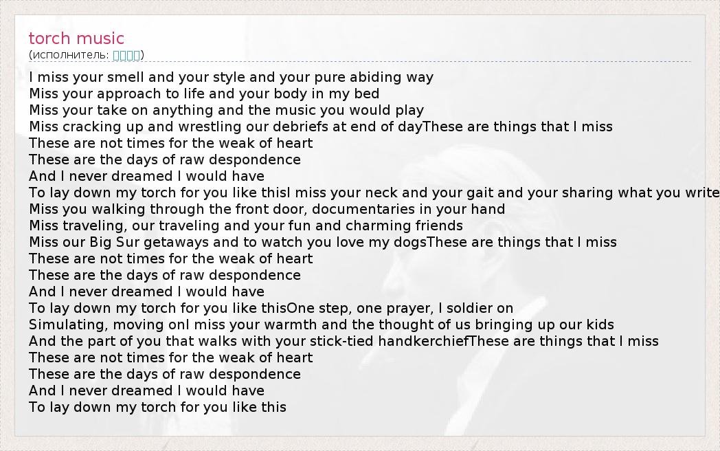 To lay down my torch for you like thisI miss your neck and your gait and your sharing what you write