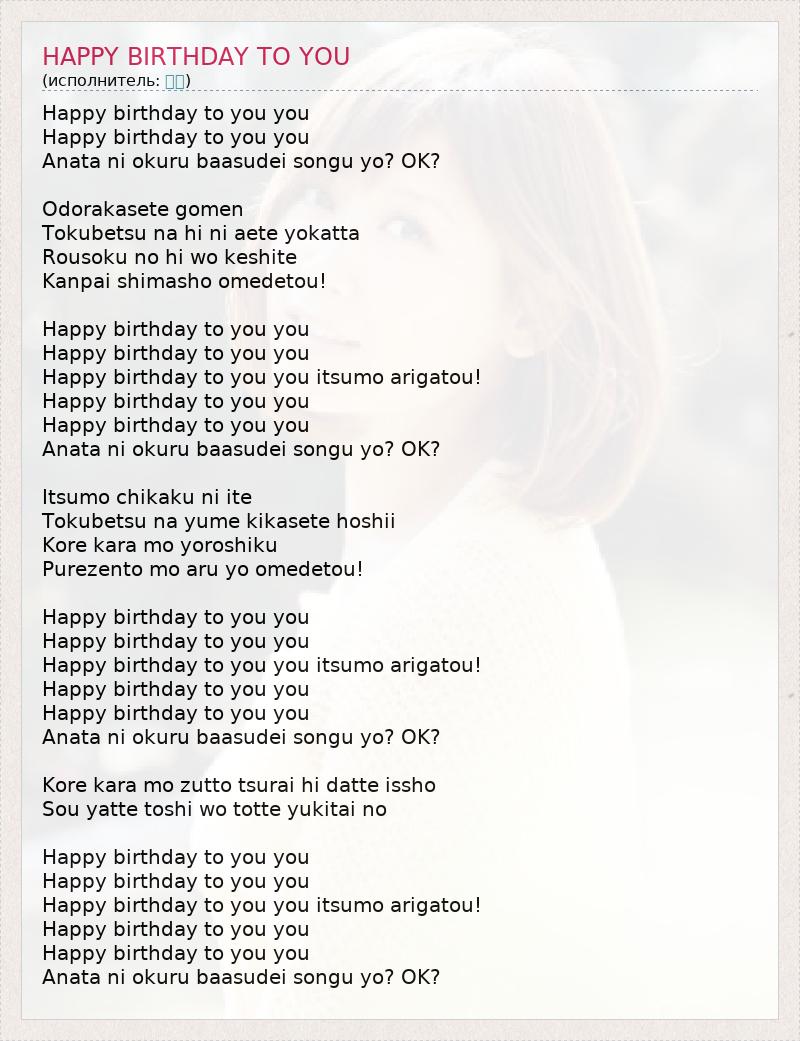 Happy birthday to you you Happy birthday to you you Anata ni okuru baasudei songu yo? OK? Odorakasete gomen Tokubetsu na hi ni aete yokatta Rousoku no hi wo keshite Kanpai shimasho omedetou! Happy birthday to you you Happy birthday to you you Happy birthday to you you itsumo arigatou! Happy birthday to you you Happy birthday to you you Anata ni okuru baasudei songu yo? OK? Itsumo chikaku ni ite Tokubetsu na yume kikasete hoshii Kore kara mo yoroshiku Purezento mo aru yo omedetou! Happy birthday to you you Happy birthday to you you Happy birthday to you you itsumo arigatou! Happy birthday to you you Happy birthday to you you Anata ni okuru baasudei songu yo? OK? Kore kara mo zutto tsurai hi datte issho Sou yatte toshi wo totte yukitai no Happy birthday to you you Happy birthday to you you Happy birthday to you you itsumo arigatou! Happy birthday to you you Happy birthday to you you Anata ni okuru baasudei songu yo? OK?