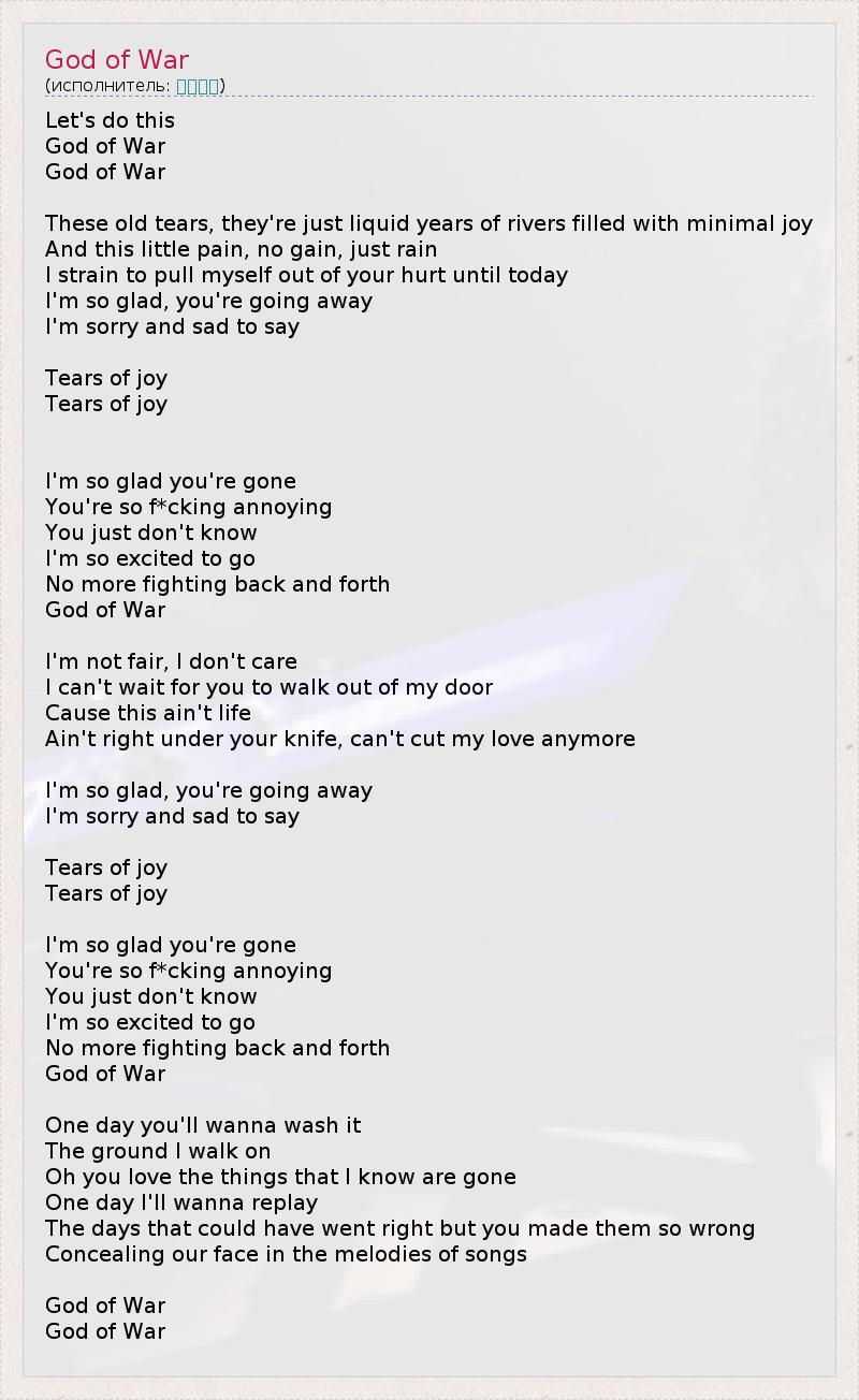 Let's do this God of War God of War These old tears, they're just liquid years of rivers filled with minimal joy And this little pain, no gain, just rain I strain to pull myself out of your hurt until today I'm so glad, you're going away I'm sorry and sad to say Tears of joy Tears of joy I'm so glad you're gone You're so f*cking annoying You just don't know I'm so excited to go No more fighting back and forth God of War I'm not fair, I don't care I can't wait for you to walk out of my door Cause this ain't life Ain't right under your knife, can't cut my love anymore I'm so glad, you're going away I'm sorry and sad to say Tears of joy Tears of joy I'm so glad you're gone You're so f*cking annoying You just don't know I'm so excited to go No more fighting back and forth God of War One day you'll wanna wash it The ground I walk on Oh you love the things that I know are gone One day I'll wanna replay The days that could have went right but you made them so wrong Concealing our face in the melodies of songs God of War God of War