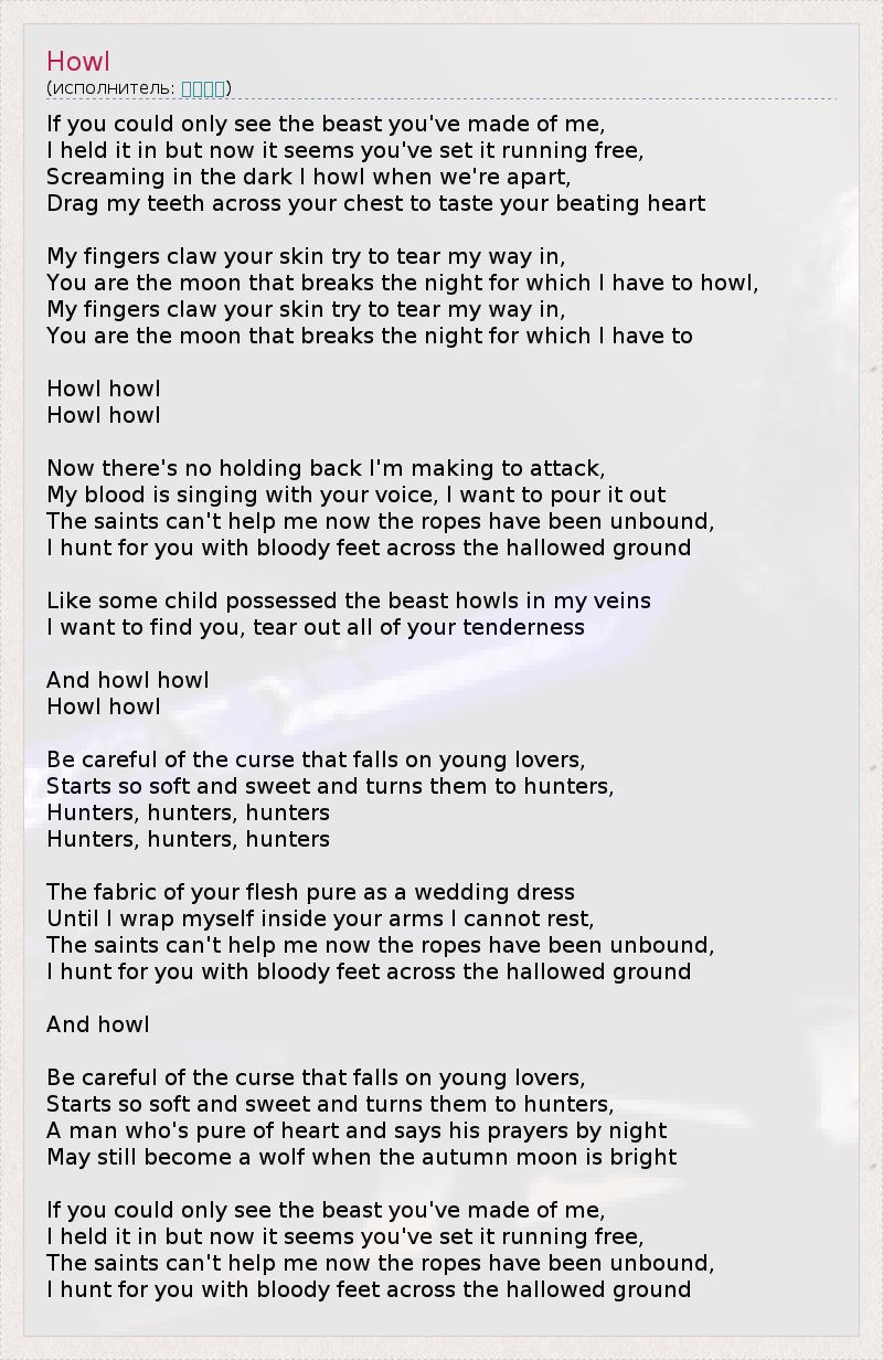 If you could only see the beast you've made of me, I held it in but now it seems you've set it running free, Screaming in the dark I howl when we're apart, Drag my teeth across your chest to taste your beating heart My fingers claw your skin try to tear my way in, You are the moon that breaks the night for which I have to howl, My fingers claw your skin try to tear my way in, You are the moon that breaks the night for which I have to Howl howl Howl howl Now there's no holding back I'm making to attack, My blood is singing with your voice, I want to pour it out The saints can't help me now the ropes have been unbound, I hunt for you with bloody feet across the hallowed ground Like some child possessed the beast howls in my veins I want to find you, tear out all of your tenderness And howl howl Howl howl Be careful of the curse that falls on young lovers, Starts so soft and sweet and turns them to hunters, Hunters, hunters, hunters Hunters, hunters, hunters The fabric of your flesh pure as a wedding dress Until I wrap myself inside your arms I cannot rest, The saints can't help me now the ropes have been unbound, I hunt for you with bloody feet across the hallowed ground And howl Be careful of the curse that falls on young lovers, Starts so soft and sweet and turns them to hunters, A man who's pure of heart and says his prayers by night May still become a wolf when the autumn moon is bright If you could only see the beast you've made of me, I held it in but now it seems you've set it running free, The saints can't help me now the ropes have been unbound, I hunt for you with bloody feet across the hallowed ground