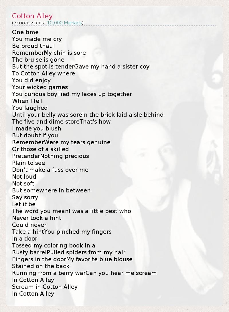 А как ты думаешь, о чем песня "Cotton Alley" ?