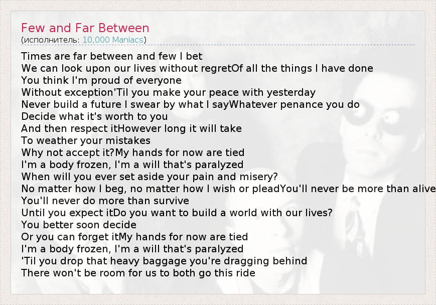А как ты думаешь, о чем песня "Few and Far Between" ?