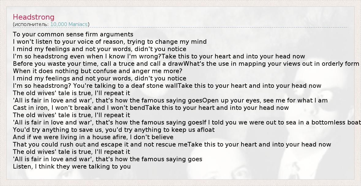 To your common sense firm arguments I won't listen to your voice of reason, trying to change my mind I mind my feelings and not your words, didn't you notice I'm so headstrong even when I know I'm wrong?Take this to your heart and into your head now Before you waste your time, call a truce and call a drawWhat's the use in mapping your views out in orderly form When it does nothing but confuse and anger me more? I mind my feelings and not your words, didn't you notice I'm so headstrong? You're talking to a deaf stone wallTake this to your heart and into your head now The old wives' tale is true, I'll repeat it 'All is fair in love and war', that's how the famous saying goesOpen up your eyes, see me for what I am Cast in iron, I won't break and I won't bendTake this to your heart and into your head now The old wives' tale is true, I'll repeat it 'All is fair in love and war', that's how the famous saying goesIf I told you we were out to sea in a bottomless boat You'd try anything to save us, you'd try anything to keep us afloat And if we were living in a house afire, I don't believe That you could rush out and escape it and not rescue meTake this to your heart and into your head now The old wives' tale is true, I'll repeat it 'All is fair in love and war', that's how the famous saying goes Listen, I think they were talking to you