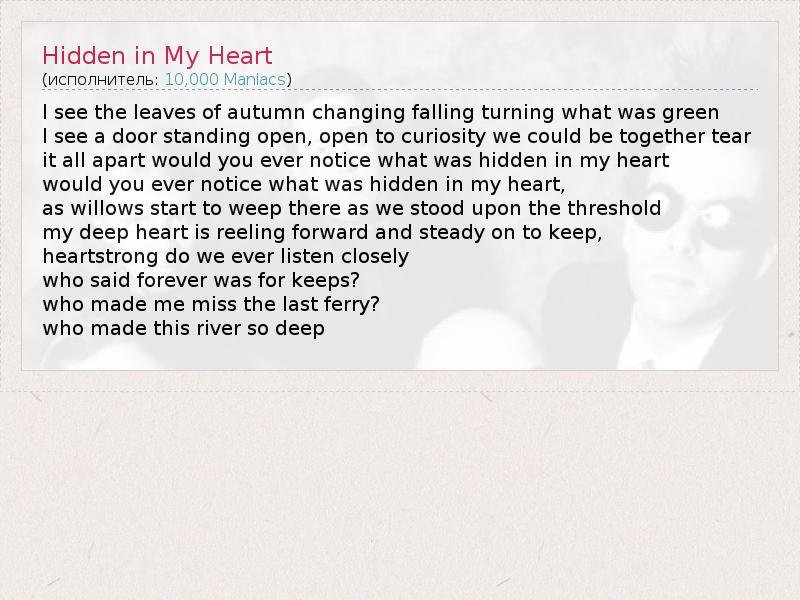 А как ты думаешь, о чем песня "Hidden in My Heart" ?