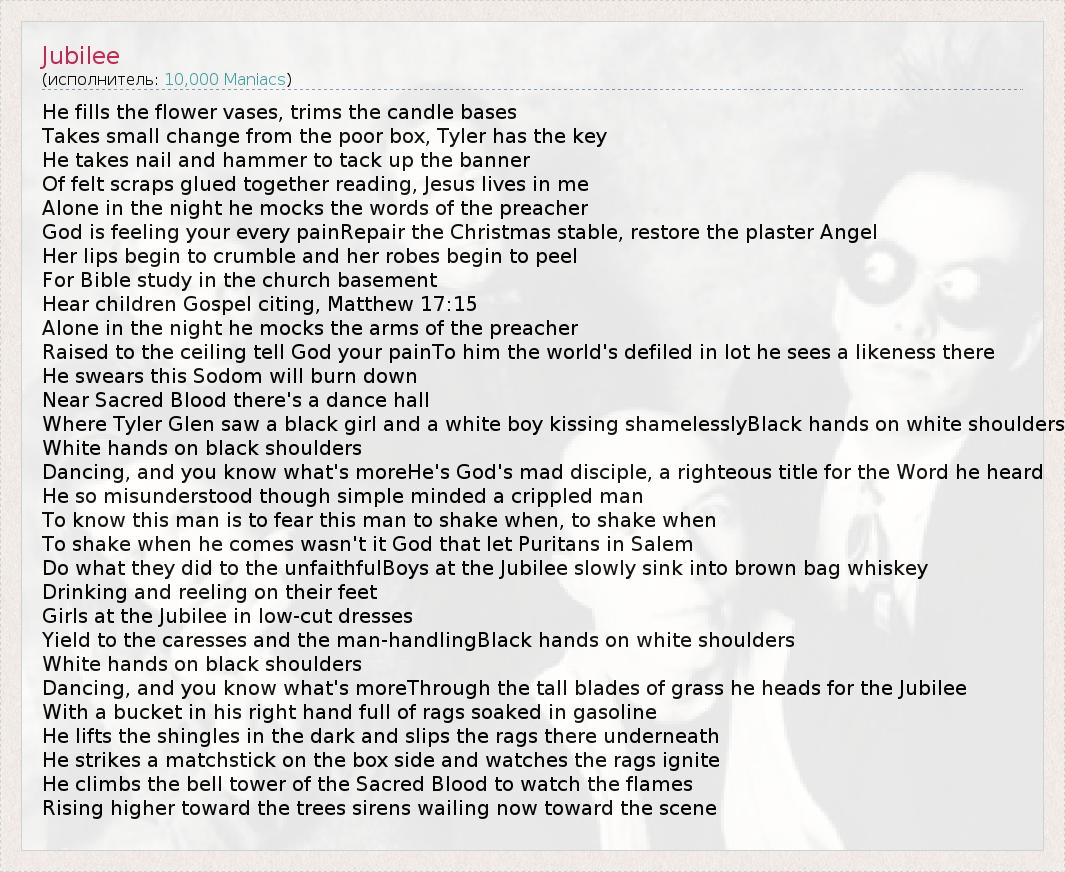 Это интересно:10,000 Мэниакс (10,000 Maniacs) - американская группа 1980-х годов. Впервые появилась в городе Джеймстаун (штат Нью-Йорк) в 1981 в составе: Натали Мерчент (вокал), Джером Огастиньяк (барабаны), Роберт Бак (гитара), Деннис Дрю (клавишные) и Стивен Густафсон (бас). Музыканты играли кавер-версии песен таких групп, как JOY DIVISION и GANG OF FOUR. В сентябре 1993 Натали Мерчент начала свою сольную карьеру.Дискография:HOPE... продолжение