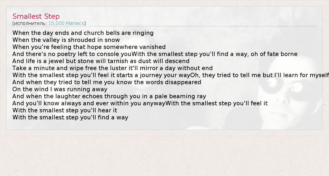 When the day ends and church bells are ringing When the valley is shrouded in snow When you're feeling that hope somewhere vanished And there's no poetry left to console youWith the smallest step you'll find a way, oh of fate borne And life is a jewel but stone will tarnish as dust will descend Take a minute and wipe free the luster it'll mirror a day without end With the smallest step you'll feel it starts a journey your wayOh, they tried to tell me but I'll learn for myself And when they tried to tell me you know the words disappeared On the wind I was running away And when the laughter echoes through you in a pale beaming ray And you'll know always and ever within you anywayWith the smallest step you'll feel it With the smallest step you'll hear it With the smallest step you'll find a way