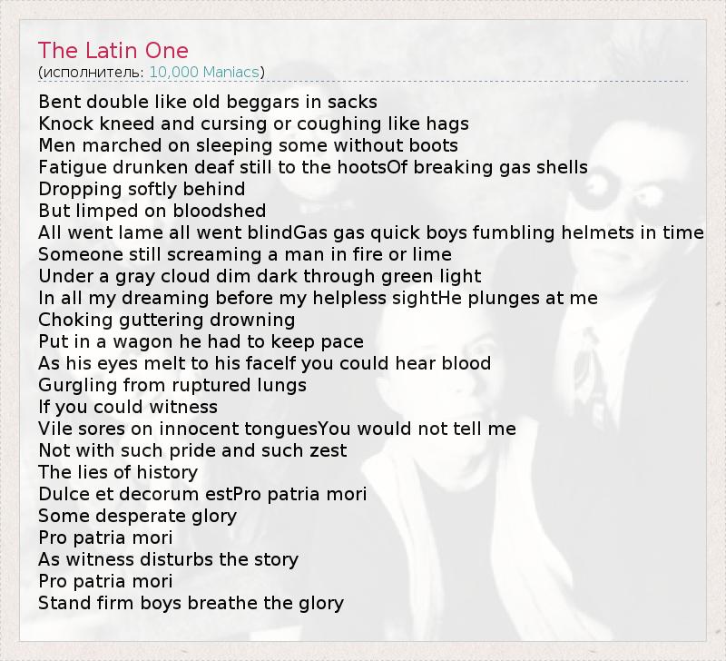 Bent double like old beggars in sacks Knock kneed and cursing or coughing like hags Men marched on sleeping some without boots Fatigue drunken deaf still to the hootsOf breaking gas shells Dropping softly behind But limped on bloodshed All went lame all went blindGas gas quick boys fumbling helmets in time Someone still screaming a man in fire or lime Under a gray cloud dim dark through green light In all my dreaming before my helpless sightHe plunges at me Choking guttering drowning Put in a wagon he had to keep pace As his eyes melt to his faceIf you could hear blood Gurgling from ruptured lungs If you could witness Vile sores on innocent tonguesYou would not tell me Not with such pride and such zest The lies of history Dulce et decorum estPro patria mori Some desperate glory Pro patria mori As witness disturbs the story Pro patria mori Stand firm boys breathe the glory