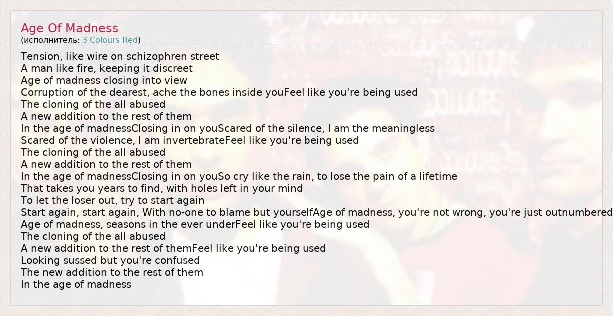 Tension, like wire on schizophren street A man like fire, keeping it discreet Age of madness closing into view Corruption of the dearest, ache the bones inside youFeel like you're being used The cloning of the all abused A new addition to the rest of them In the age of madnessClosing in on youScared of the silence, I am the meaningless Scared of the violence, I am invertebrateFeel like you're being used The cloning of the all abused A new addition to the rest of them In the age of madnessClosing in on youSo cry like the rain, to lose the pain of a lifetime That takes you years to find, with holes left in your mind To let the loser out, try to start again Start again, start again, With no-one to blame but yourselfAge of madness, you're not wrong, you're just outnumbered Age of madness, seasons in the ever underFeel like you're being used The cloning of the all abused A new addition to the rest of themFeel like you're being used Looking sussed but you're confused The new addition to the rest of them In the age of madness