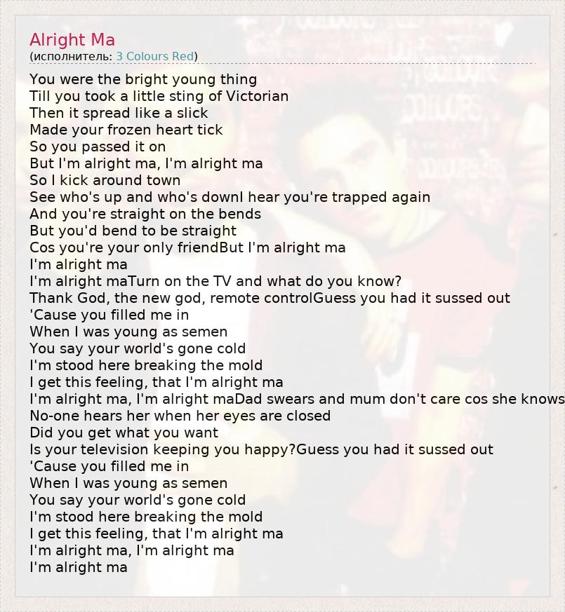 You were the bright young thing Till you took a little sting of Victorian Then it spread like a slick Made your frozen heart tick So you passed it on But I'm alright ma, I'm alright ma So I kick around town See who's up and who's downI hear you're trapped again And you're straight on the bends But you'd bend to be straight Cos you're your only friendBut I'm alright ma I'm alright ma I'm alright maTurn on the TV and what do you know? Thank God, the new god, remote controlGuess you had it sussed out 'Cause you filled me in When I was young as semen You say your world's gone cold I'm stood here breaking the mold I get this feeling, that I'm alright ma I'm alright ma, I'm alright maDad swears and mum don't care cos she knows No-one hears her when her eyes are closed Did you get what you want Is your television keeping you happy?Guess you had it sussed out 'Cause you filled me in When I was young as semen You say your world's gone cold I'm stood here breaking the mold I get this feeling, that I'm alright ma I'm alright ma, I'm alright ma I'm alright ma