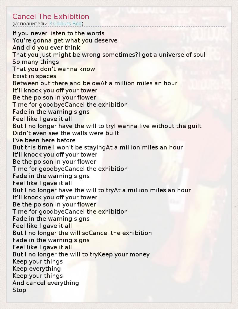 If you never listen to the words You're gonna get what you deserve And did you ever think That you just might be wrong sometimes?I got a universe of soul So many things That you don't wanna know Exist in spaces Between out there and belowAt a million miles an hour It'll knock you off your tower Be the poison in your flower Time for goodbyeCancel the exhibition Fade in the warning signs Feel like I gave it all But I no longer have the will to tryI wanna live without the guilt Didn't even see the walls were built I've been here before But this time I won't be stayingAt a million miles an hour It'll knock you off your tower Be the poison in your flower Time for goodbyeCancel the exhibition Fade in the warning signs Feel like I gave it all But I no longer have the will to tryAt a million miles an hour It'll knock you off your tower Be the poison in your flower Time for goodbyeCancel the exhibition Fade in the warning signs Feel like I gave it all But I no longer the will soCancel the exhibition Fade in the warning signs Feel like I gave it all But I no longer the will to tryKeep your money Keep your things Keep everything Keep your things And cancel everything Stop