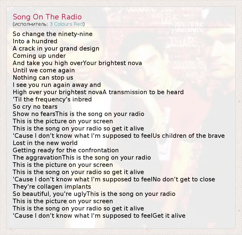 So change the ninety-nine Into a hundred A crack in your grand design Coming up under And take you high overYour brightest nova Until we come again Nothing can stop us I see you run again away and High over your brightest novaA transmission to be heard 'Til the frequency's inbred So cry no tears Show no fearsThis is the song on your radio This is the picture on your screen This is the song on your radio so get it alive 'Cause I don't know what I'm supposed to feelUs children of the brave Lost in the new world Getting ready for the confrontation The aggravationThis is the song on your radio This is the picture on your screen This is the song on your radio so get it alive 'Cause I don't know what I'm supposed to feelNo don't get to close They're collagen implants So beautiful, you're uglyThis is the song on your radio This is the picture on your screen This is the song on your radio so get it alive 'Cause I don't know what I'm supposed to feelGet it alive