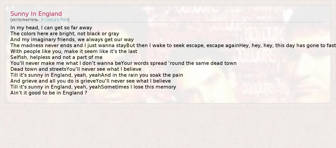 А как ты думаешь, о чем песня "Sunny In England" ?