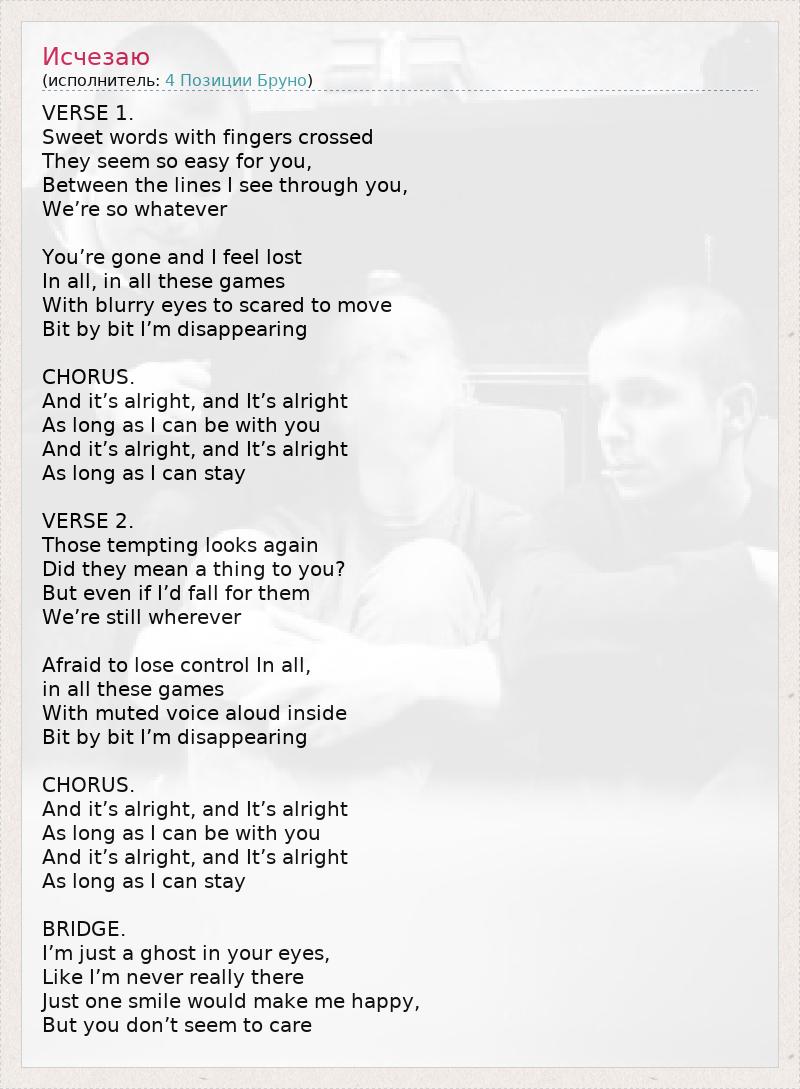 VERSE 1. Sweet words with fingers crossed They seem so easy for you, Between the lines I see through you, We’re so whatever You’re gone and I feel lost In all, in all these games With blurry eyes to scared to move Bit by bit I’m disappearing CHORUS. And it’s alright, and It’s alright As long as I can be with you And it’s alright, and It’s alright As long as I can stay VERSE 2. Those tempting looks again Did they mean a thing to you? But even if I’d fall for them We’re still wherever Afraid to lose control In all, in all these games With muted voice aloud inside Bit by bit I’m disappearing CHORUS. And it’s alright, and It’s alright As long as I can be with you And it’s alright, and It’s alright As long as I can stay BRIDGE. I’m just a ghost in your eyes, Like I’m never really there Just one smile would make me happy, But you don’t seem to care