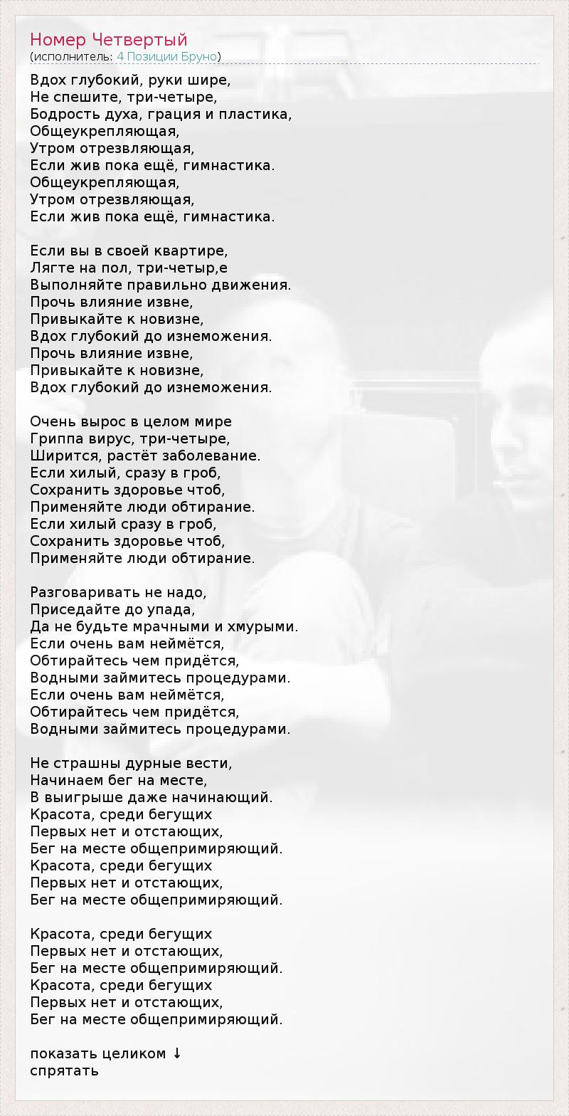Вдох глубокий, руки шире, Не спешите, три-четыре, Бодрость духа, грация и пластика, Общеукрепляющая, Утром отрезвляющая, Если жив пока ещё, гимнастика. Общеукрепляющая, Утром отрезвляющая, Если жив пока ещё, гимнастика. Если вы в своей квартире, Лягте на пол, три-четыр,е Выполняйте правильно движения. Прочь влияние извне, Привыкайте к новизне, Вдох глубокий до изнеможения. Прочь влияние извне, Привыкайте к новизне, Вдох глубокий до изнеможения. Очень вырос в целом мире Гриппа вирус, три-четыре, Ширится, растёт заболевание. Если хилый, сразу в гроб, Сохранить здоровье чтоб, Применяйте люди обтирание. Если хилый сразу в гроб, Сохранить здоровье чтоб, Применяйте люди обтирание. Разговаривать не надо, Приседайте до упада, Да не будьте мрачными и хмурыми. Если очень вам неймётся, Обтирайтесь чем придётся, Водными займитесь процедурами. Если очень вам неймётся, Обтирайтесь чем придётся, Водными займитесь процедурами. Не страшны дурные вести, Начинаем бег на месте, В выигрыше даже начинающий. Красота, среди бегущих Первых нет и отстающих, Бег на месте общепримиряющий. Красота, среди бегущих Первых нет и отстающих, Бег на месте общепримиряющий. Красота, среди бегущих Первых нет и отстающих, Бег на месте общепримиряющий. Красота, среди бегущих Первых нет и отстающих, Бег на месте общепримиряющий. показать целиком ↓ спрятать