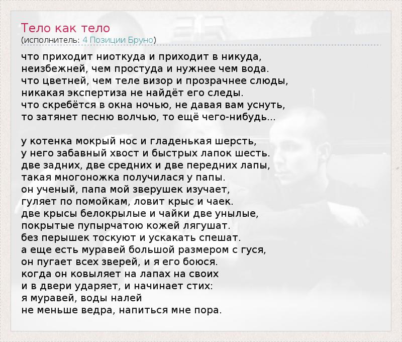 что приходит ниоткуда и приходит в никуда, неизбежней, чем простуда и нужнее чем вода. что цветней, чем теле визор и прозрачнее слюды, никакая экспертиза не найдёт его следы. что скребётся в окна ночью, не давая вам уснуть, то затянет песню волчью, то ещё чего-нибудь... у котенка мокрый нос и гладенькая шерсть, у него забавный хвост и быстрых лапок шесть. две задних, две средних и две передних лапы, такая многоножка получилася у папы. он ученый, папа мой зверушек изучает, гуляет по помойкам, ловит крыс и чаек. две крысы белокрылые и чайки две унылые, покрытые пупырчатою кожей лягушат. без перышек тоскуют и ускакать спешат. а еще есть муравей большой размером с гуся, он пугает всех зверей, и я его боюся. когда он ковыляет на лапах на своих и в двери ударяет, и начинает стих: я муравей, воды налей не меньше ведра, напиться мне пора.