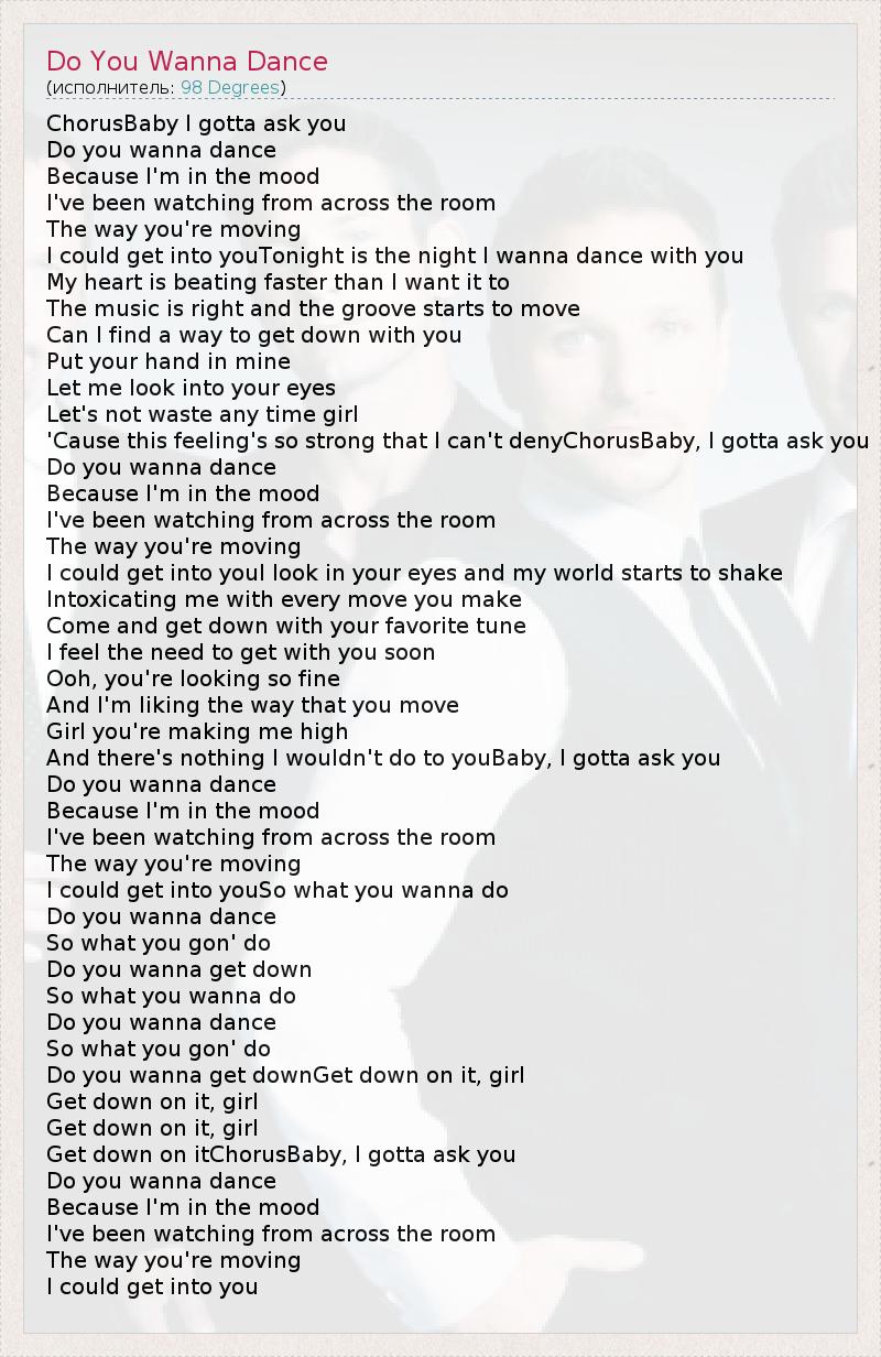 ChorusBaby I gotta ask you Do you wanna dance Because I'm in the mood I've been watching from across the room The way you're moving I could get into youTonight is the night I wanna dance with you My heart is beating faster than I want it to The music is right and the groove starts to move Can I find a way to get down with you Put your hand in mine Let me look into your eyes Let's not waste any time girl 'Cause this feeling's so strong that I can't denyChorusBaby, I gotta ask you Do you wanna dance Because I'm in the mood I've been watching from across the room The way you're moving I could get into youI look in your eyes and my world starts to shake Intoxicating me with every move you make Come and get down with your favorite tune I feel the need to get with you soon Ooh, you're looking so fine And I'm liking the way that you move Girl you're making me high And there's nothing I wouldn't do to youBaby, I gotta ask you Do you wanna dance Because I'm in the mood I've been watching from across the room The way you're moving I could get into youSo what you wanna do Do you wanna dance So what you gon' do Do you wanna get down So what you wanna do Do you wanna dance So what you gon' do Do you wanna get downGet down on it, girl Get down on it, girl Get down on it, girl Get down on itChorusBaby, I gotta ask you Do you wanna dance Because I'm in the mood I've been watching from across the room The way you're moving I could get into you