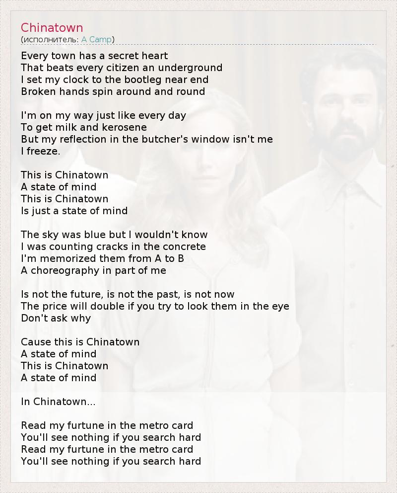 Every town has a secret heart That beats every citizen an underground I set my clock to the bootleg near end Broken hands spin around and round I'm on my way just like every day To get milk and kerosene But my reflection in the butcher's window isn't me I freeze. This is Chinatown A state of mind This is Chinatown Is just a state of mind The sky was blue but I wouldn't know I was counting cracks in the concrete I'm memorized them from A to B A choreography in part of me Is not the future, is not the past, is not now The price will double if you try to look them in the eye Don't ask why Cause this is Chinatown A state of mind This is Chinatown A state of mind In Chinatown... Read my furtune in the metro card You'll see nothing if you search hard Read my furtune in the metro card You'll see nothing if you search hard