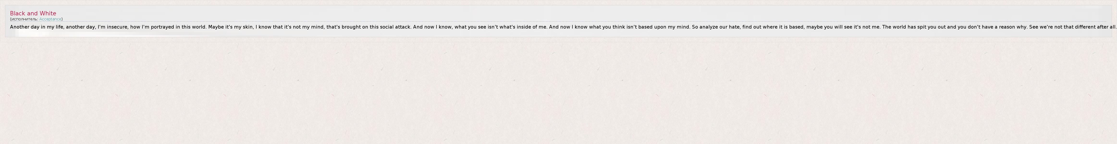 Another day in my life, another day, I'm insecure, how I'm portrayed in this world. Maybe it's my skin, I know that it's not my mind, that's brought on this social attack. And now I know, what you see isn't what's inside of me. And now I know what you think isn't based upon my mind. So analyze our hate, find out where it is based, maybe you will see it's not me. The world has spit you out and you don't have a reason why. See we're not that different after all.