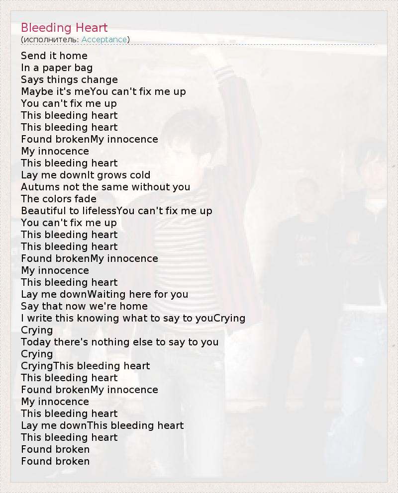 Send it home In a paper bag Says things change Maybe it's meYou can't fix me up You can't fix me up This bleeding heart This bleeding heart Found brokenMy innocence My innocence This bleeding heart Lay me downIt grows cold Autums not the same without you The colors fade Beautiful to lifelessYou can't fix me up You can't fix me up This bleeding heart This bleeding heart Found brokenMy innocence My innocence This bleeding heart Lay me downWaiting here for you Say that now we're home I write this knowing what to say to youCrying Crying Today there's nothing else to say to you Crying CryingThis bleeding heart This bleeding heart Found brokenMy innocence My innocence This bleeding heart Lay me downThis bleeding heart This bleeding heart Found broken Found broken