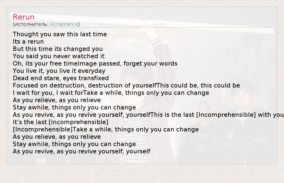 Это интересно:Acceptance - альтернативная рок-группа, образованная в Сиэтле в 1998 году. Их первый EP "Lost for Words" вышел в 2000 году, следующий - "Black Lines to Battlefields" - в 2003. Последняя пластинка "Phantoms" датирована 2005 годом.