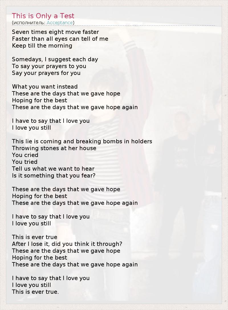 Seven times eight move faster Faster than all eyes can tell of me Keep till the morning Somedays, I suggest each day To say your prayers to you Say your prayers for you What you want instead These are the days that we gave hope Hoping for the best These are the days that we gave hope again I have to say that I love you I love you still This lie is coming and breaking bombs in holders Throwing stones at her house You cried You tried Tell us what we want to hear Is it something that you fear? These are the days that we gave hope Hoping for the best These are the days that we gave hope again I have to say that I love you I love you still This is ever true After I lose it, did you think it through? These are the days that we gave hope Hoping for the best These are the days that we gave hope again I have to say that I love you I love you still This is ever true.