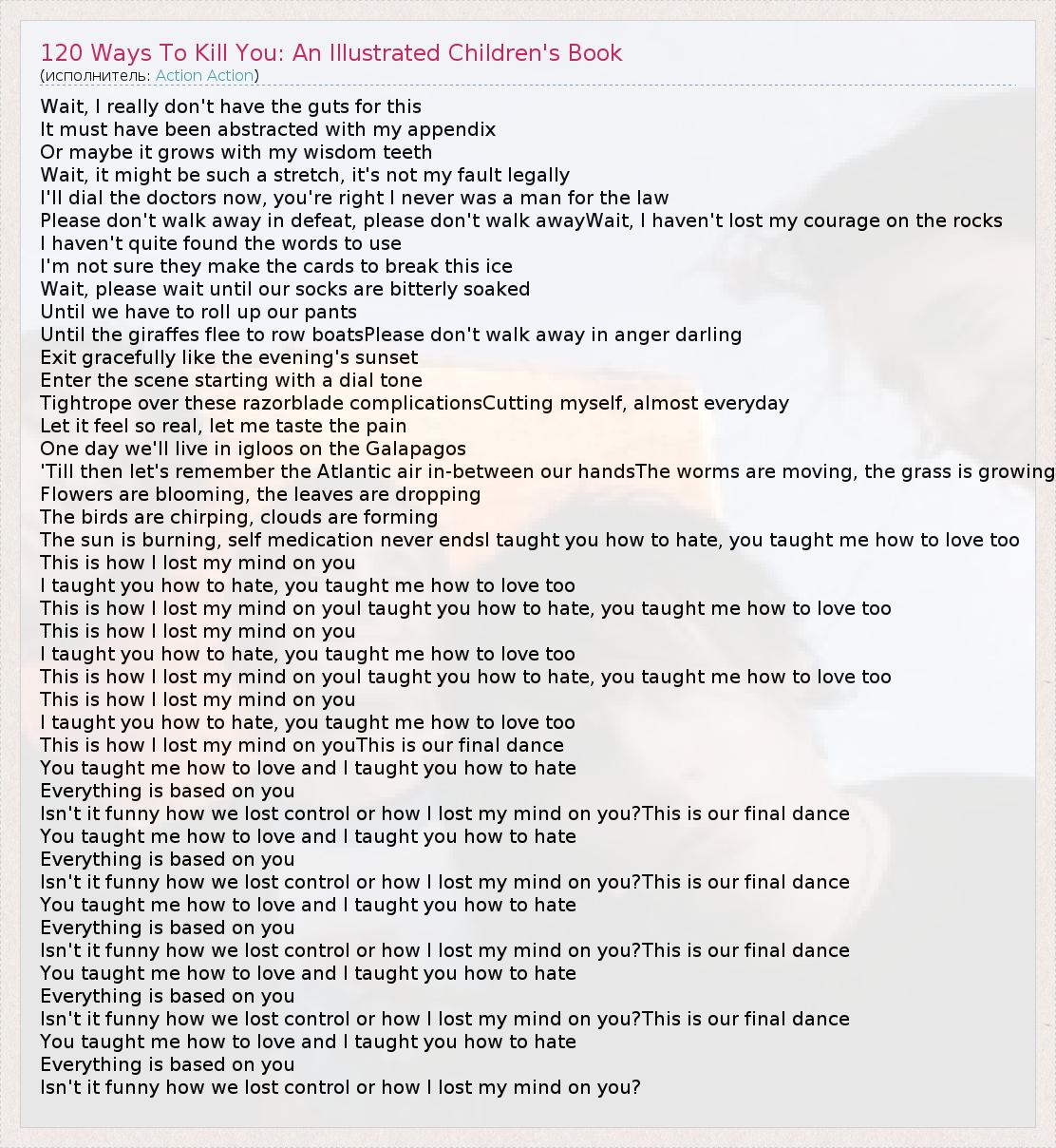 А как ты думаешь, о чем песня "120 Ways To Kill You: An Illustrated Children's Book" ?