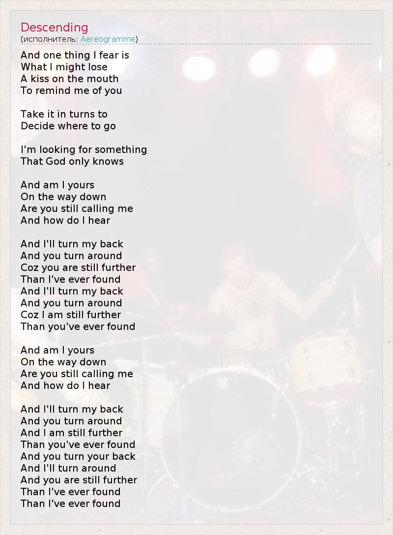 And one thing I fear is What I might lose A kiss on the mouth To remind me of you Take it in turns to Decide where to go I'm looking for something That God only knows And am I yours On the way down Are you still calling me And how do I hear And I'll turn my back And you turn around Coz you are still further Than I've ever found And I'll turn my back And you turn around Coz I am still further Than you've ever found And am I yours On the way down Are you still calling me And how do I hear And I'll turn my back And you turn around And I am still further Than you've ever found And you turn your back And I'll turn around And you are still further Than I've ever found Than I've ever found